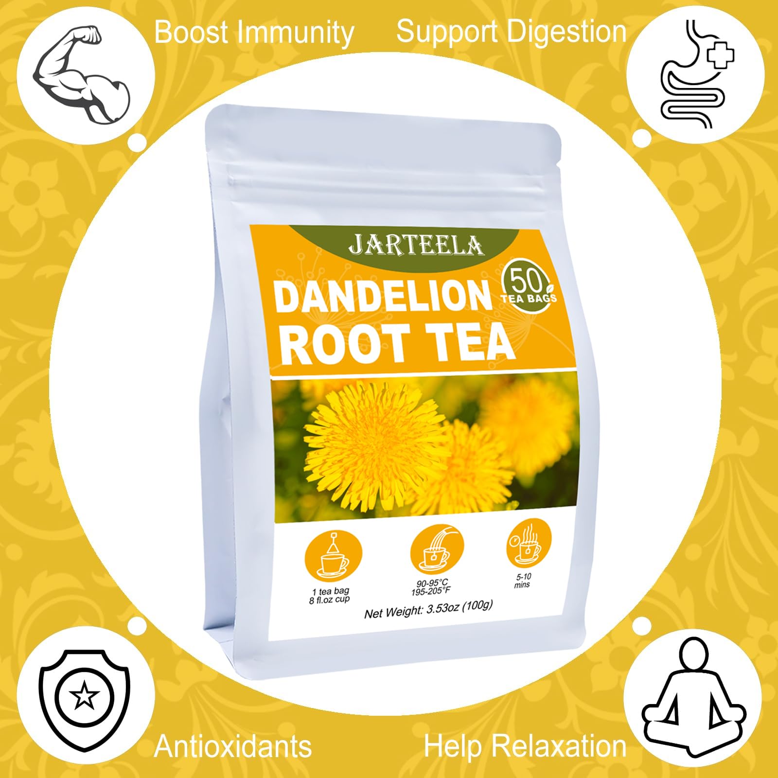 - Q: How many tea bags are included in a pack of Jarteela Dandelion Root Tea? A: Each pack of Jarteela Dandelion Root Tea contains fifty tea bags, providing ample supply for regular enjoyment.