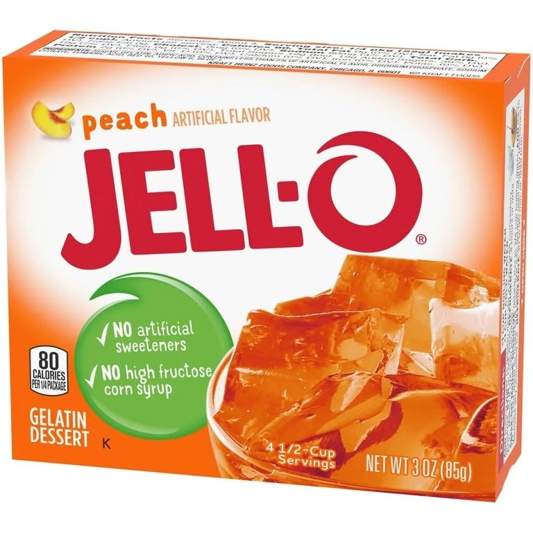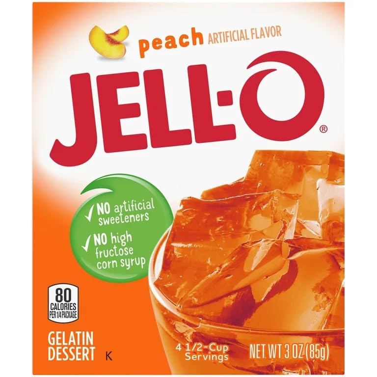 Jell-O Peach Instant Gelatin Mix is an easy to make peach flavored dessert. Perfect for cooling off on a hot day, this mouthwatering treat delivers the classic refreshingly sweet peach taste you know and love. With no artificial sweeteners and no high fructose corn syrup and fat free, this dessert is one you can feel good about sharing with your family. These 3 ounce boxes each make four 1/2-cup servings so you can prepare enough for the whole family. It's easy to make a tasty dessert for kids or adults. Simply mix the peach flavored gelatin mix with boiling water, stir in cold water and refrigerate until set.