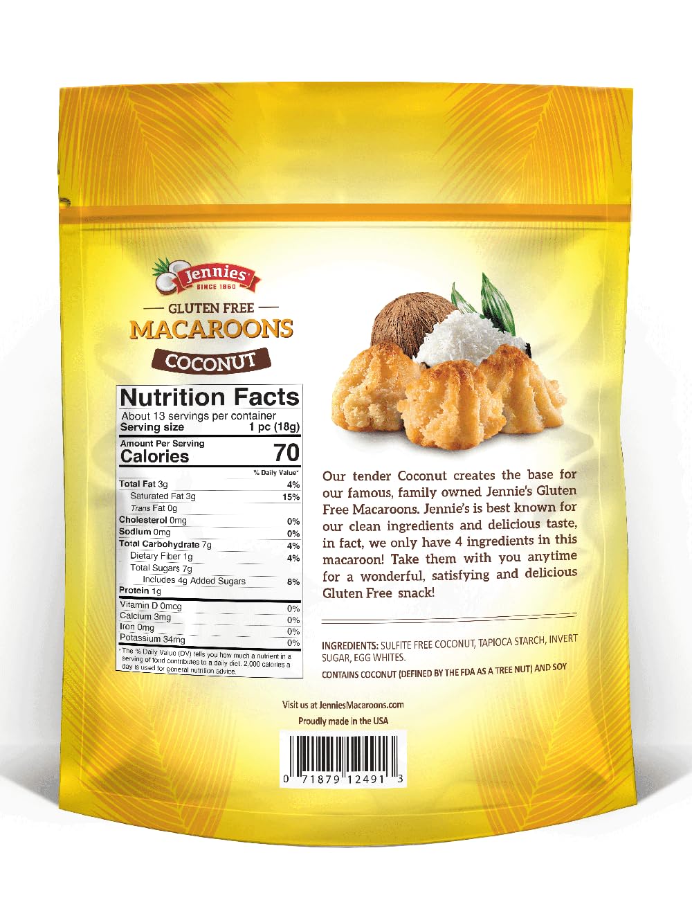 Jennies Coconut Macaroons Are Free Of Wheat, Gluten, Dairy, Yeast, Soy And Lactose Making These An Ideal Treat For Those With Food Sensitivities. We Don't Use Authentic Color, Artificial Flavor Or Chemical Preservatives, Making These Tasty Snacks All Natural. Every 8 Oz. Container Of Jennies Coconut Macaroons Contains 9 Servings With No Trans Fats.