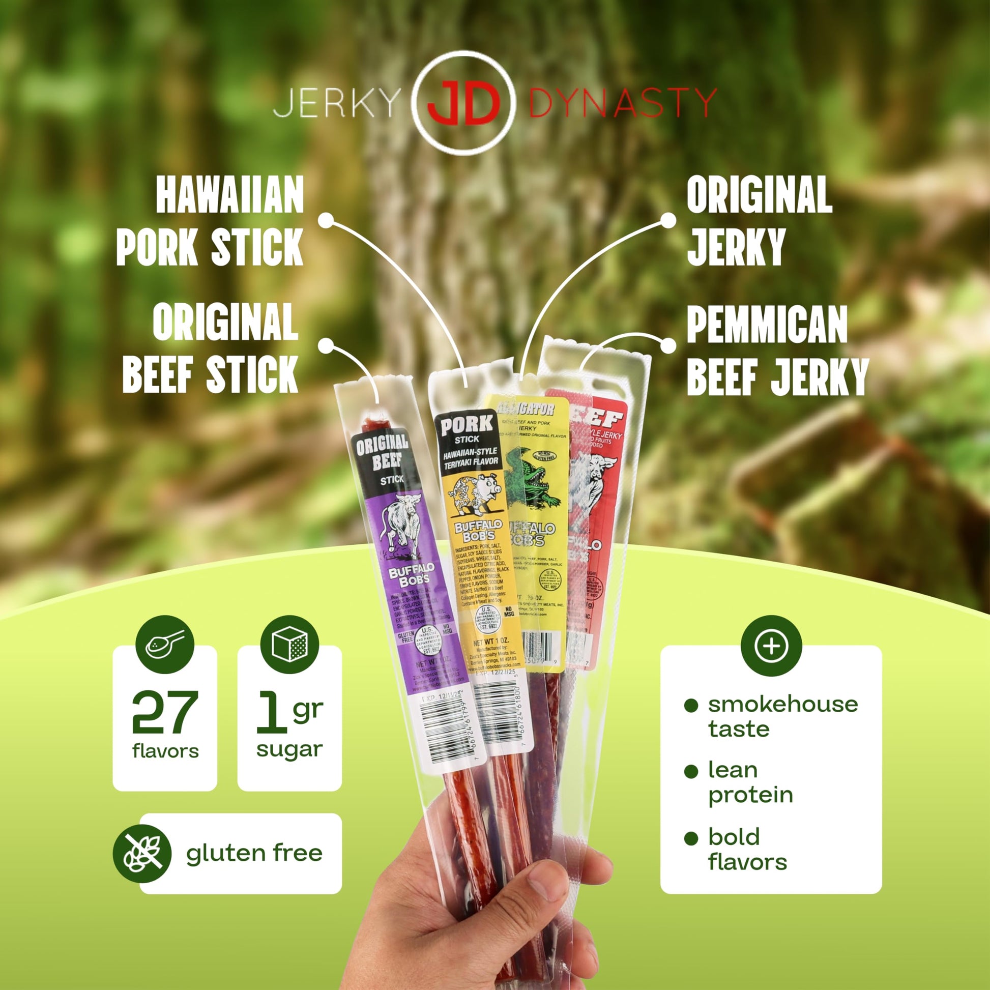 Q: What types of jerky are included in the Jerky Dynasty variety pack?A: The Jerky Dynasty variety pack includes 27 distinct types of jerky, featuring farm-raised wild game, seasoned beef, savory pork, and specialty flavors that are not available individually. This selection ensures a diverse tasting experience.