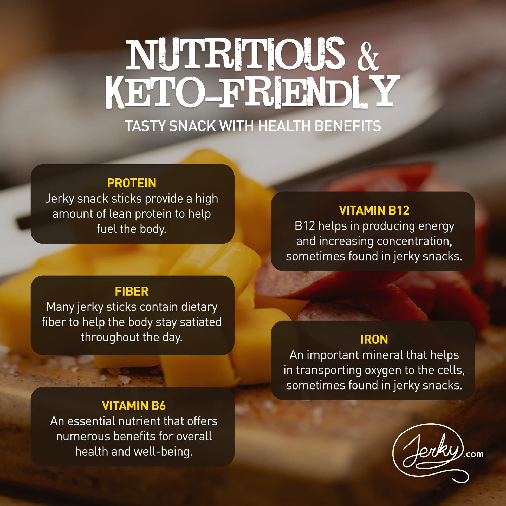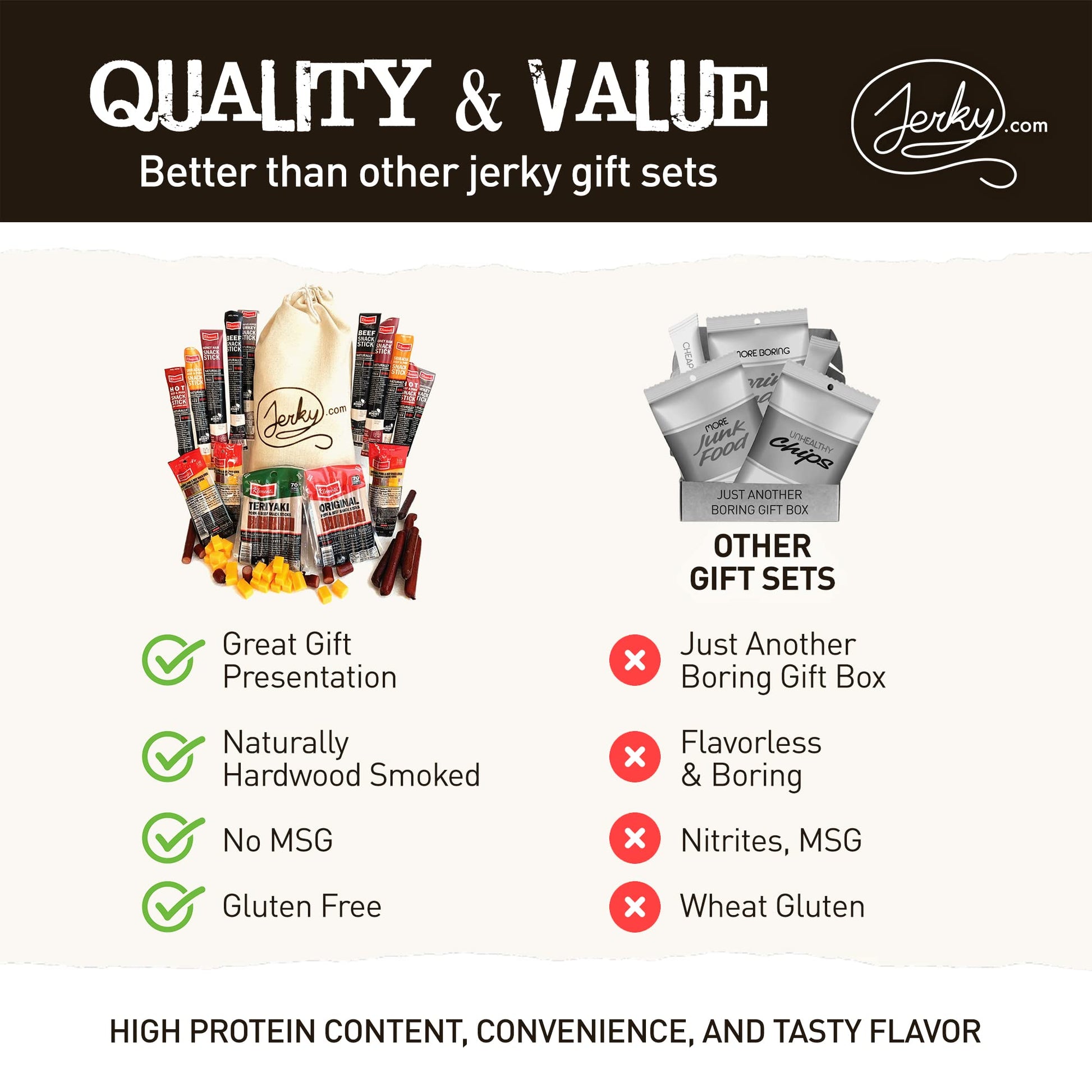 The Jerky.Com Extra Mile Gift Is The Ultimate Healthy Treat For All Jerky Lovers Out There! With A Whopping 26 (Yes, You Read That Right!) Individually Wrapped Snack Sticks, This Gift Package Is Sure To Satisfy Even The Most Discerning Taste Buds. The Assortment & Variety Of Premium Low Fat, High Protein Snack Sticks Included In This Jerky Gift Baskets Is Unmatched, And The Value It Offers Is Unbeatable. But That'S Not All. To Make This Gift Truly Exceptional, This Thoughtfully Packaged Snack Gift Set Comes With An Authentic, Iron-Branded Canvas Bag That Adds A Rustic Charm To The Overall Presentation. This Impressive Gift Pack Includes: ? 2 Cracked Pepper Turkey Snack Sticks - 0.8 Oz. Each ? 2 Honey Ham Snack Sticks - 0.8 Oz. Each ? 2 Beef Snack Sticks - 0.8 Oz. Each ? 2 Sriracha Snack Sticks - 0.8 Oz. Each ? 2 Hot Snack Sticks - 0.8 Oz. Each ? 3 Original And Cheddar Snack Sticks - 1 Oz. Each ? 1 Pack Of Original Beef Snack Sticks (5 Sticks Per Pack) ? 1 Pack Of Teriyaki Beef Snack Sticks (5 Sticks Per Pack) Don'T Just Take Our Word For It - Try It Yourself To Discover Why People Love This Gift Pack So Much! Whether You'Re Treating Yourself Or Surprising A Fellow Jerky Enthusiast, The Jerky.Com Extra Mile Gift Is The Perfect Choice!