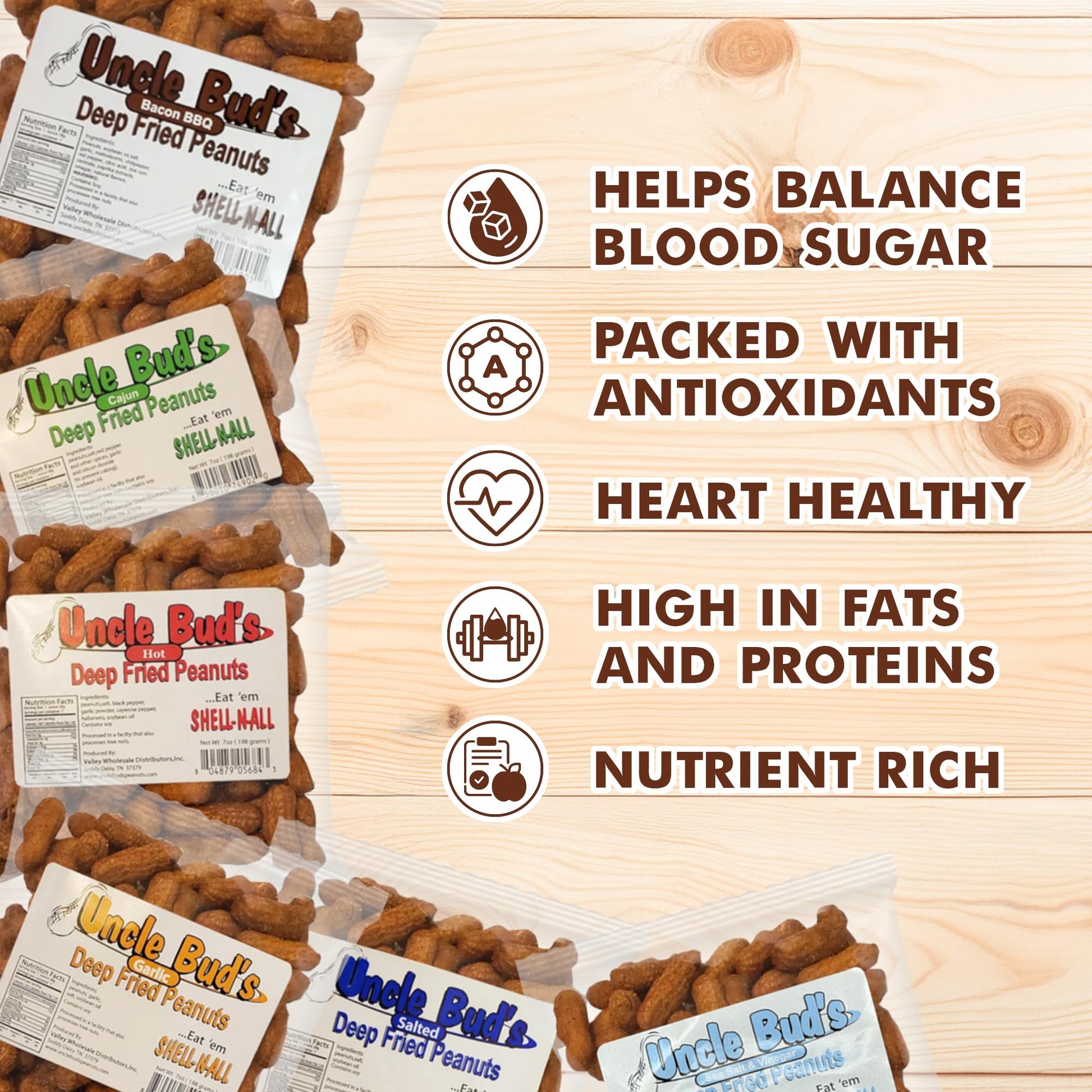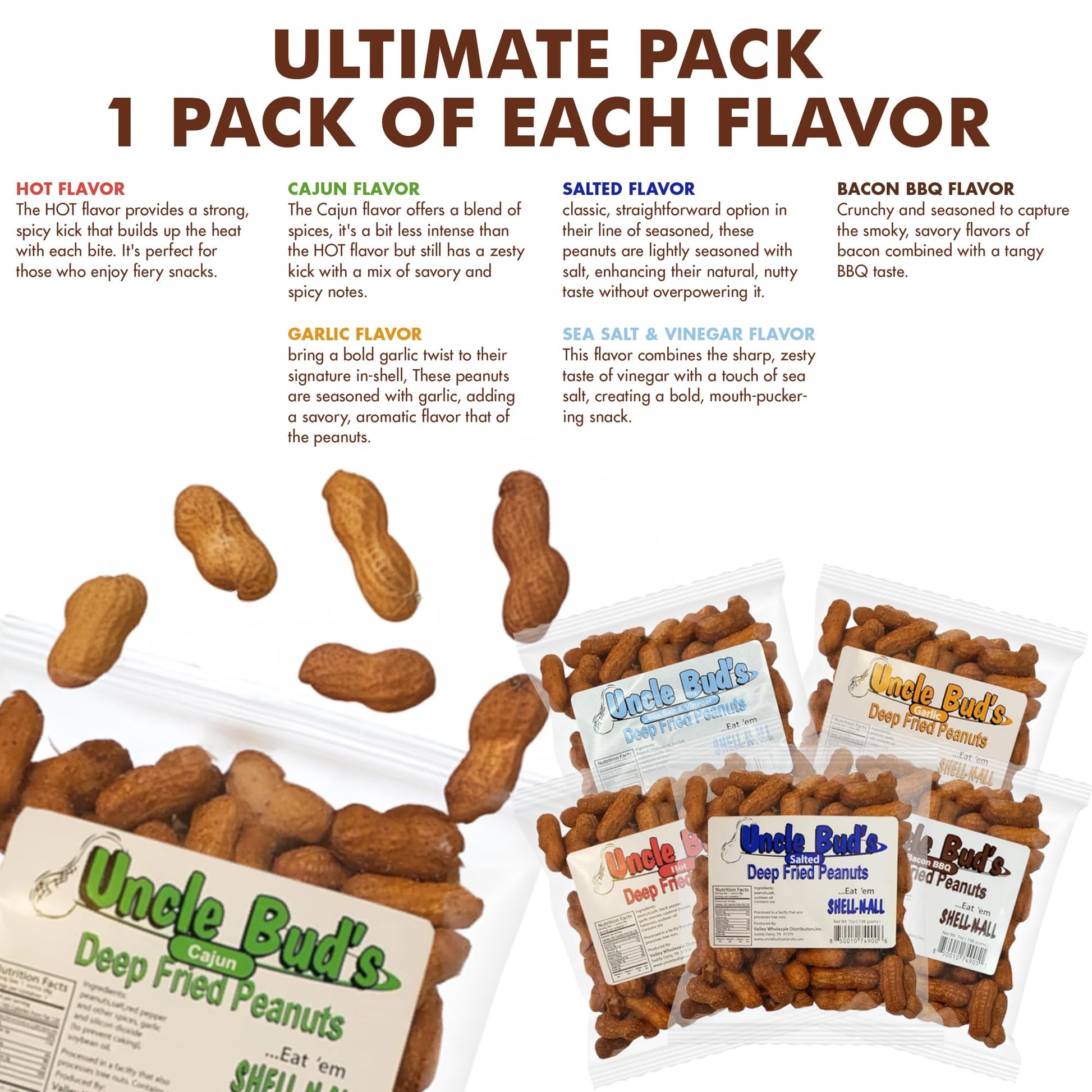 - Q: What flavors are included in Uncle Bud's Deep Fried Peanuts In Shell 6-Pack? A: The 6-pack includes six distinct flavors: Salted, Hot, Cajun, Salt & Vinegar, Old Bay, and Garlic, providing a variety of bold tastes.