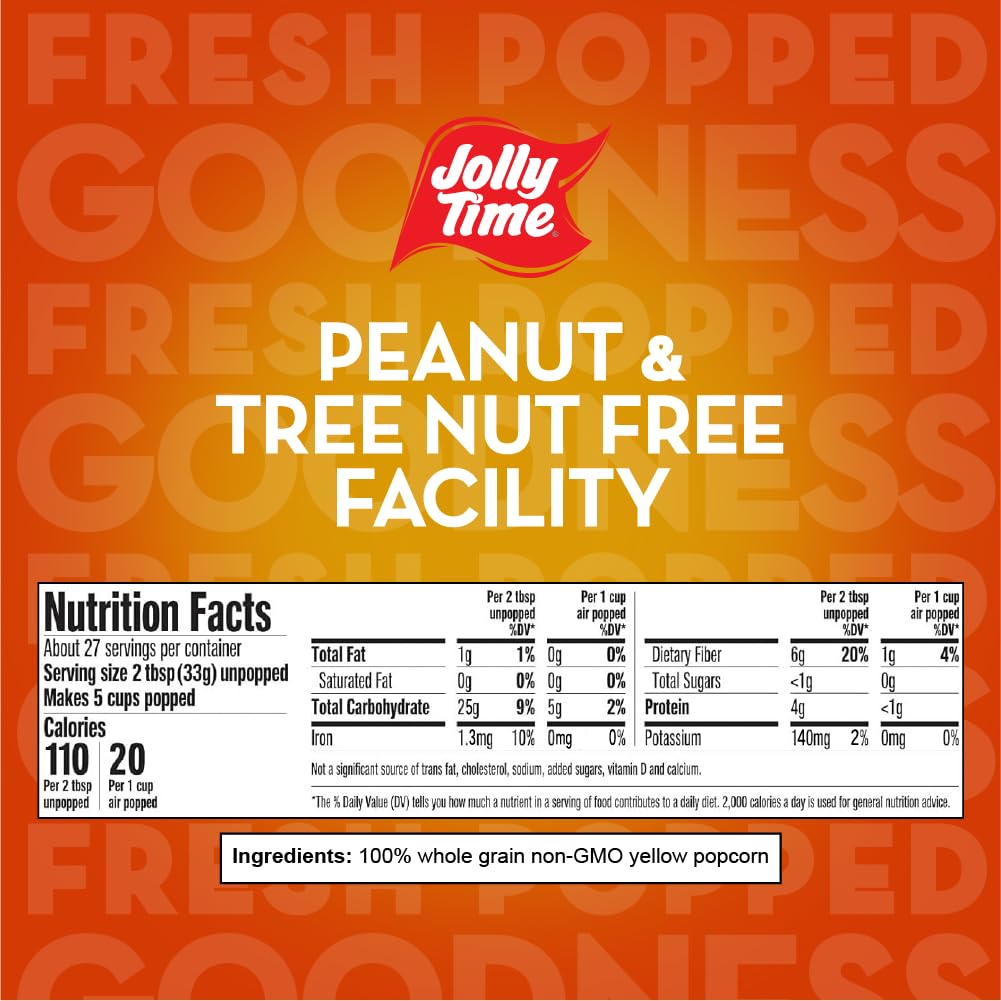 - Q: What are the benefits of using Jolly Time Unpopped Popcorn Kernels? A: Jolly Time Unpopped Popcorn Kernels are non-GMO, gluten-free, and packed with nutrients, including 4 grams of protein and 6 grams of fiber per serving. They are perfect for air poppers or stovetop methods, allowing you to enjoy delicious popcorn without added salt or butter.