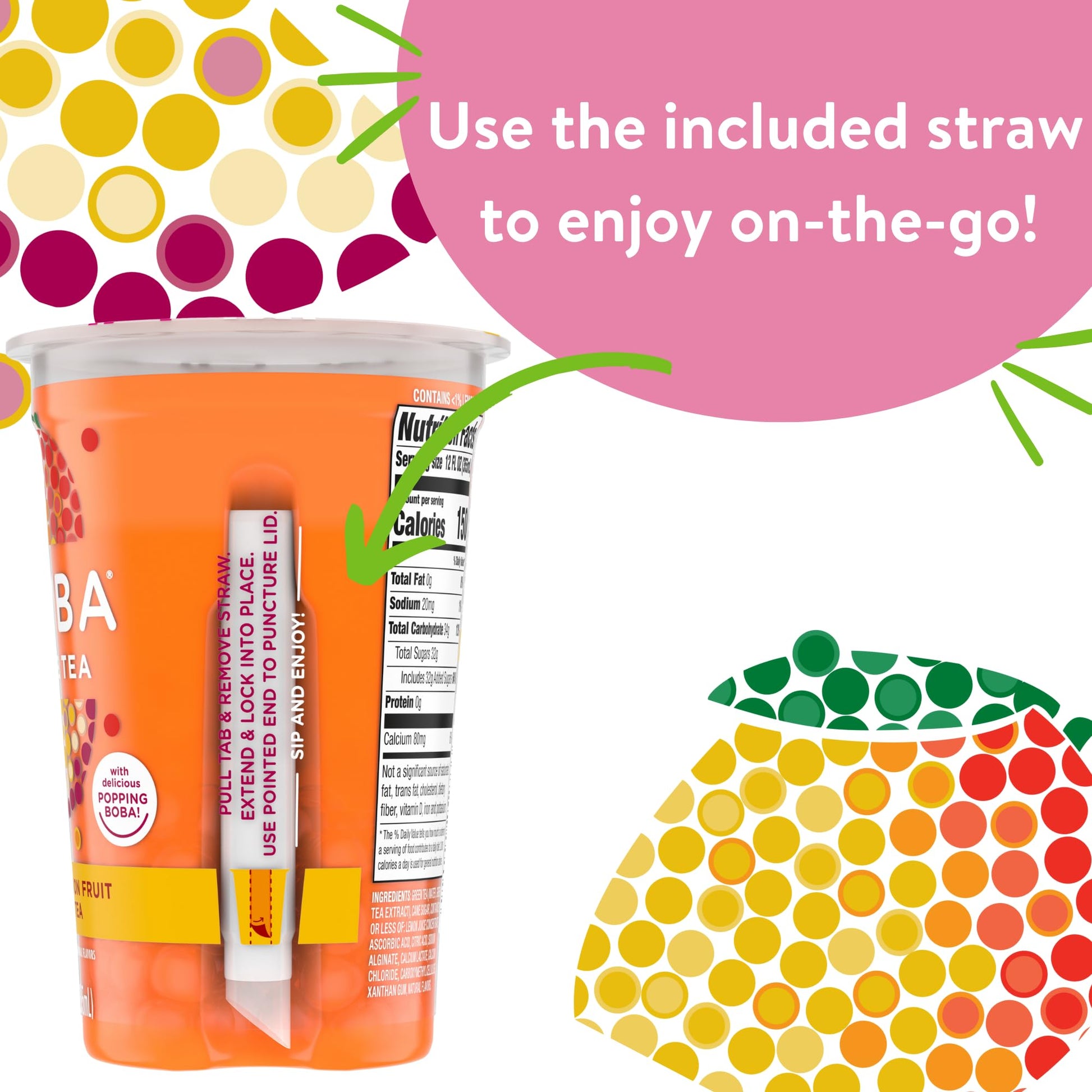 Q: How do I enjoy JOYBA Bubble Tea on the go?A: Each JOYBA Bubble Tea cup comes with an easy-to-use straw, allowing you to sip and enjoy the delicious popping boba anywhere, whether at home, work, or while traveling.