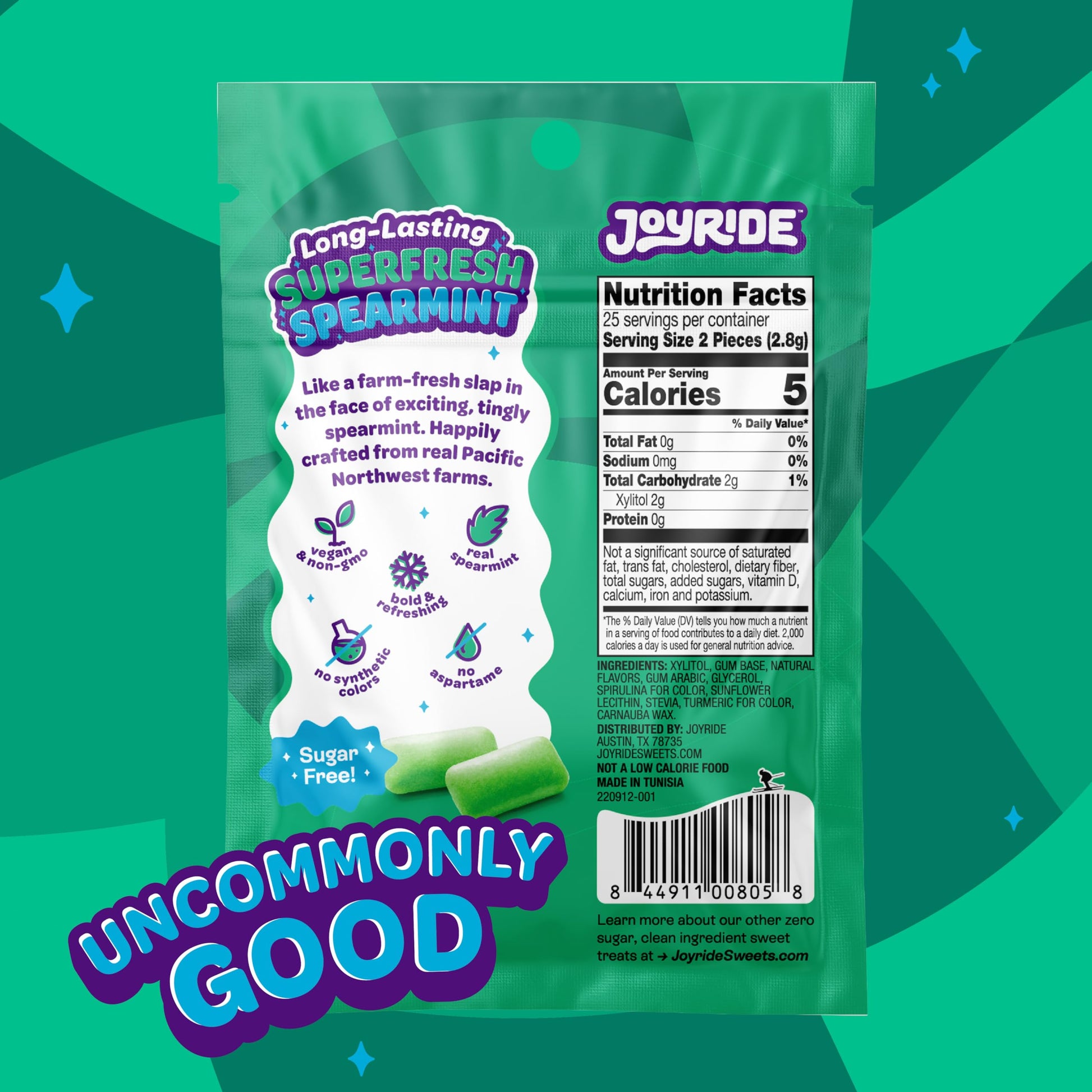Q: What are the main ingredients in Joyride Gum?A: Joyride Gum is made with clean, real food ingredients, including real spearmint sourced from American family farms. It is sweetened naturally with xylitol and colored with spirulina and turmeric, ensuring no artificial colors, flavors, or preservatives are used.