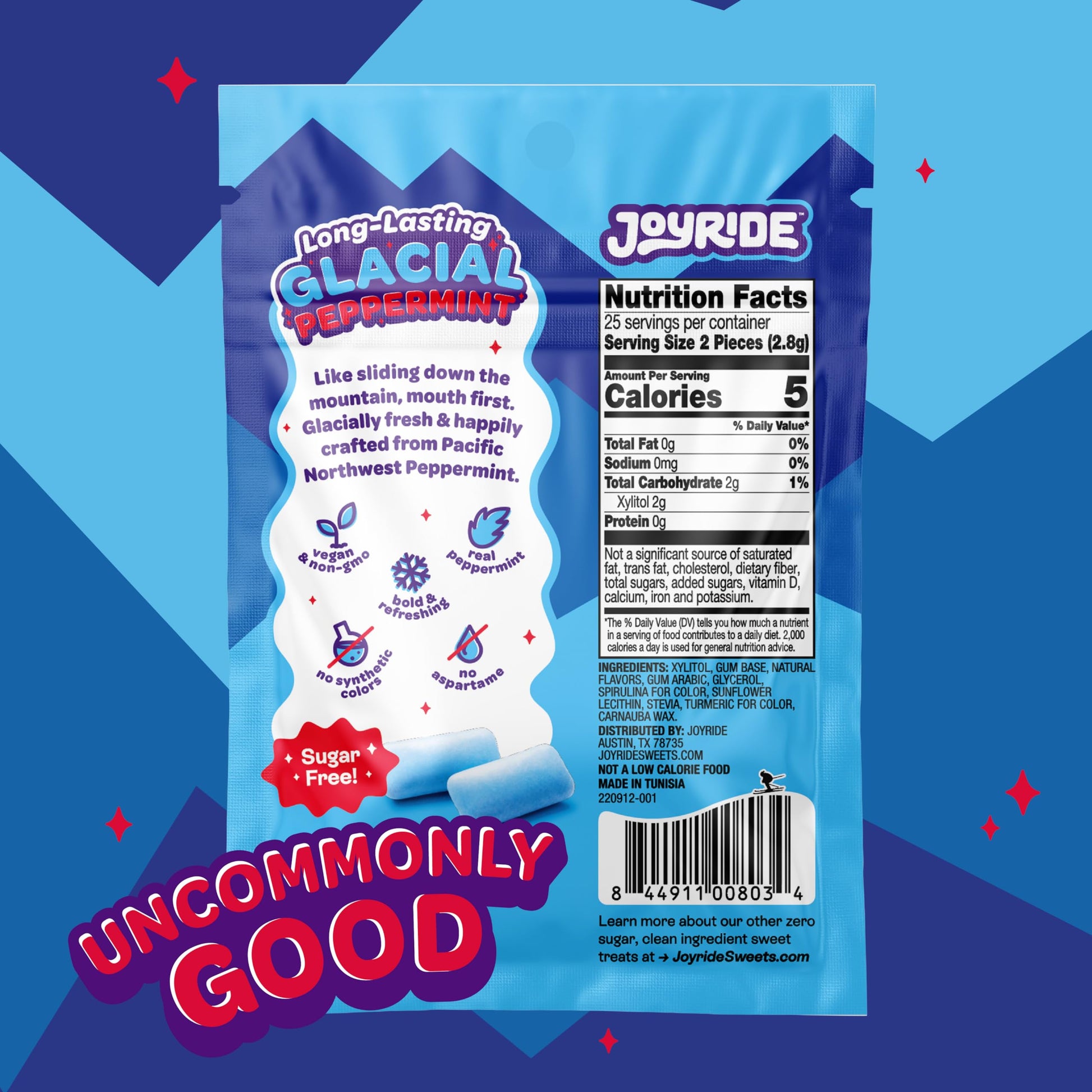 Q: What are the key ingredients in Joyride Gum?A: Joyride Gum is made with clean, real food ingredients including real peppermint sourced from American family farms. It is naturally colored with spirulina and turmeric, ensuring no artificial colors, flavors, or preservatives are used.