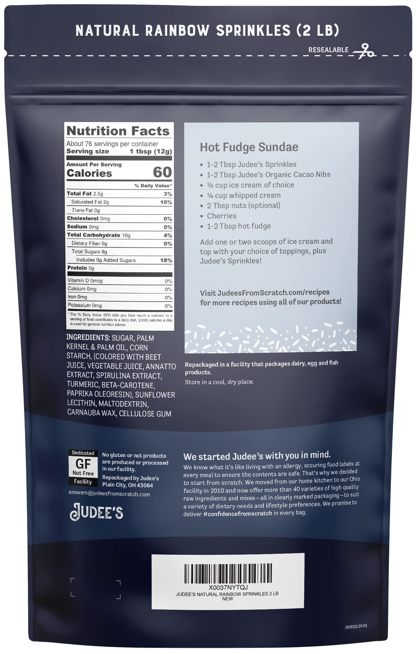 Q: Are Judee's Natural Rainbow Sprinkles gluten-free?A: Yes, Judee's Natural Rainbow Sprinkles are gluten-free and made in a dedicated gluten-free facility, making them a safe choice for those with gluten sensitivities.