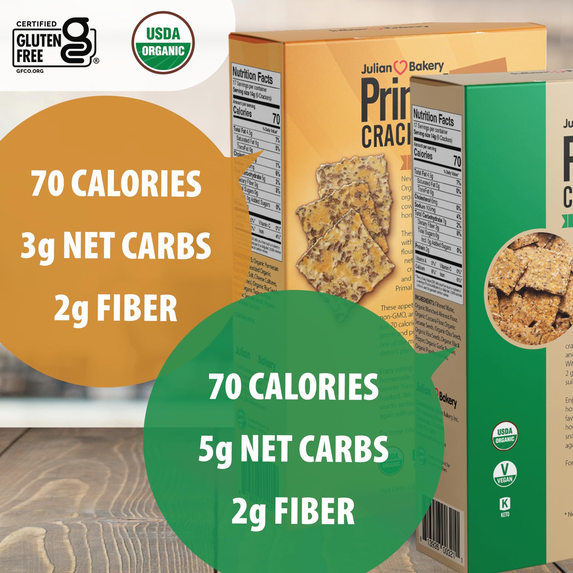- Q: How many calories and carbs are in a serving of these crackers? A: Each serving of Julian Bakery Paleo & Primal Thin Crackers, which consists of 6 crackers, contains only 70 calories and 3 net carbs, making them an excellent option for those following a low carb or ketogenic diet.