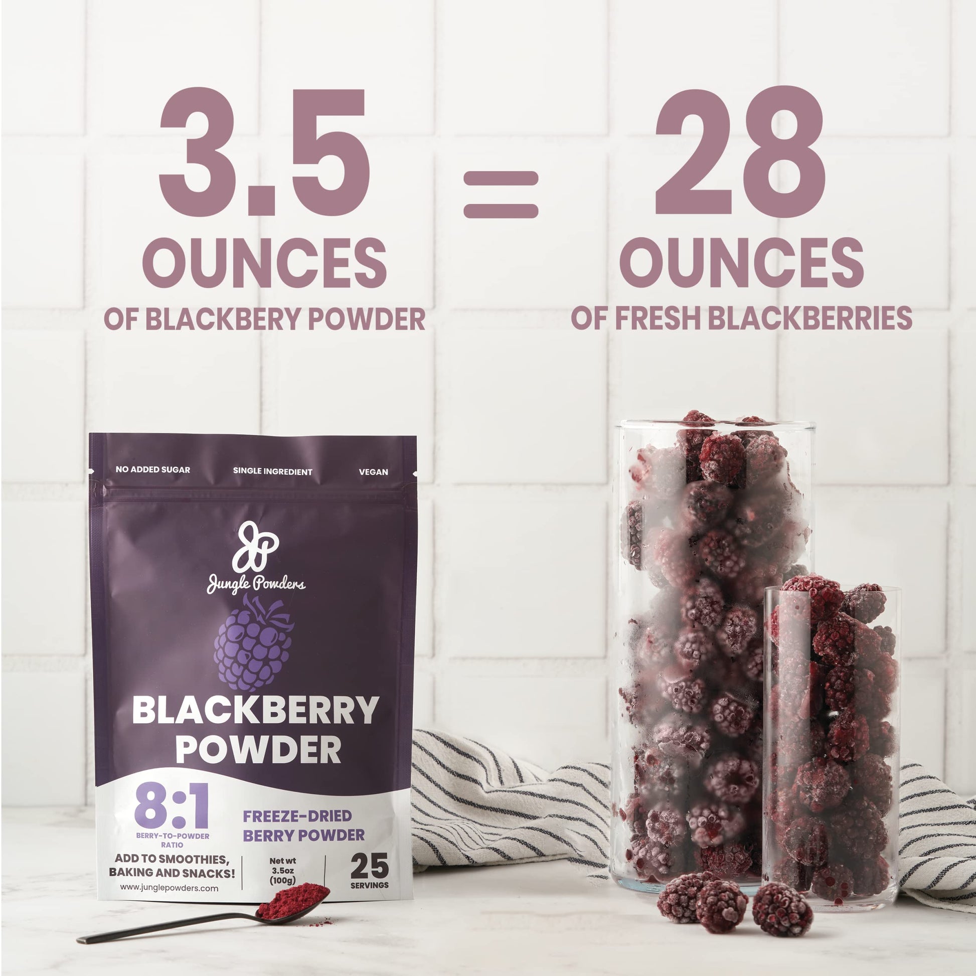 Q: What is the equivalent of 3.5 ounces of blackberry powder in fresh blackberries?A: 3.5 ounces of Jungle Powders Blackberry Powder is equivalent to approximately 28 ounces of fresh blackberries, providing a concentrated source of flavor and nutrition.