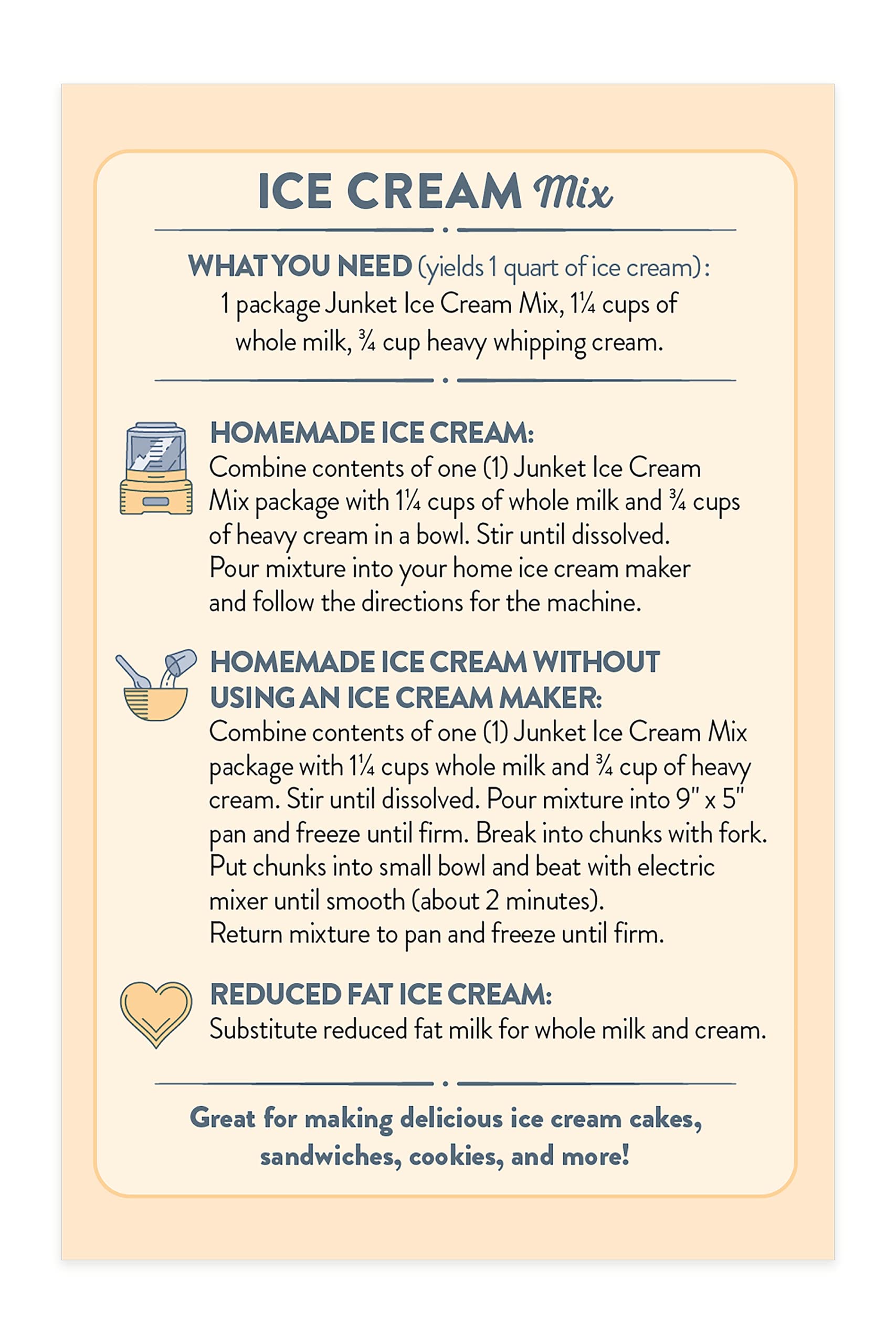 - Q: What size does the Junket Ice Cream Mix package come in? A: Junket Ice Cream Mix Very Vanilla comes in a four-ounce package, which is designed to make one quart of ice cream.