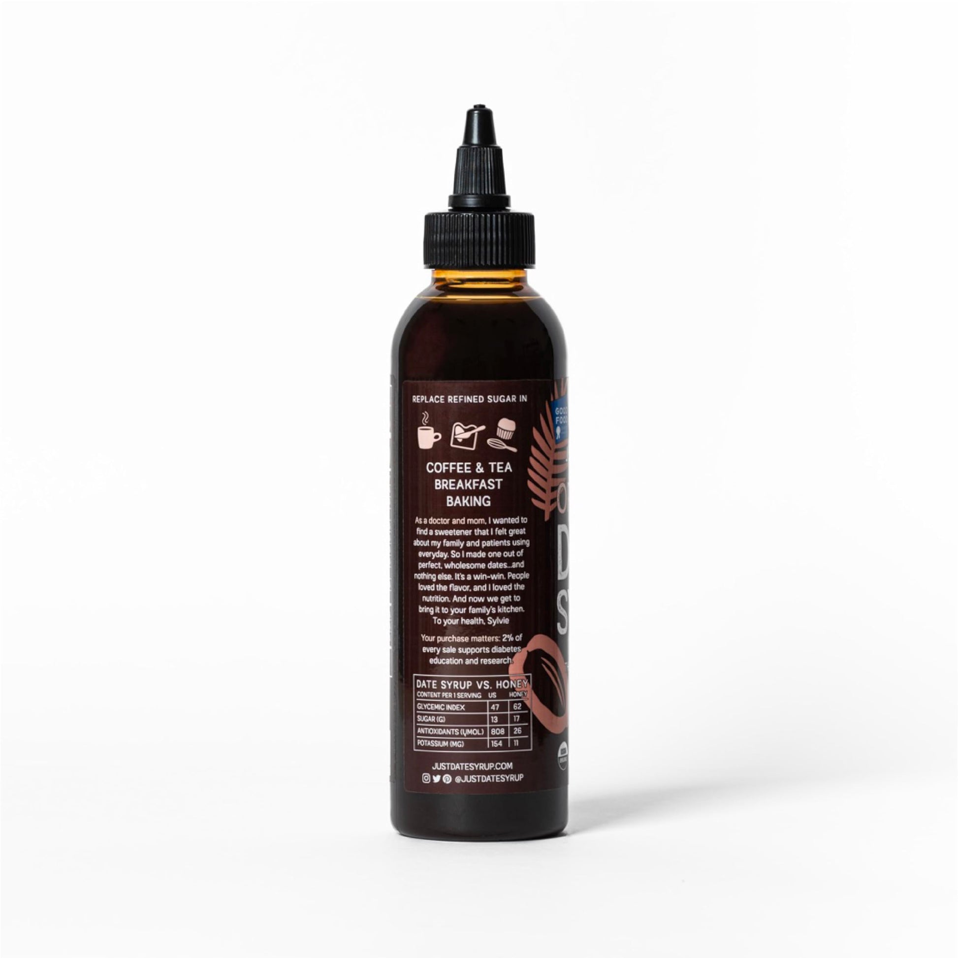 • Q: How big is the Just Date Syrup bottle? A: The bottle contains eight point eight ounces of syrup. This size is convenient for various uses in cooking and baking.