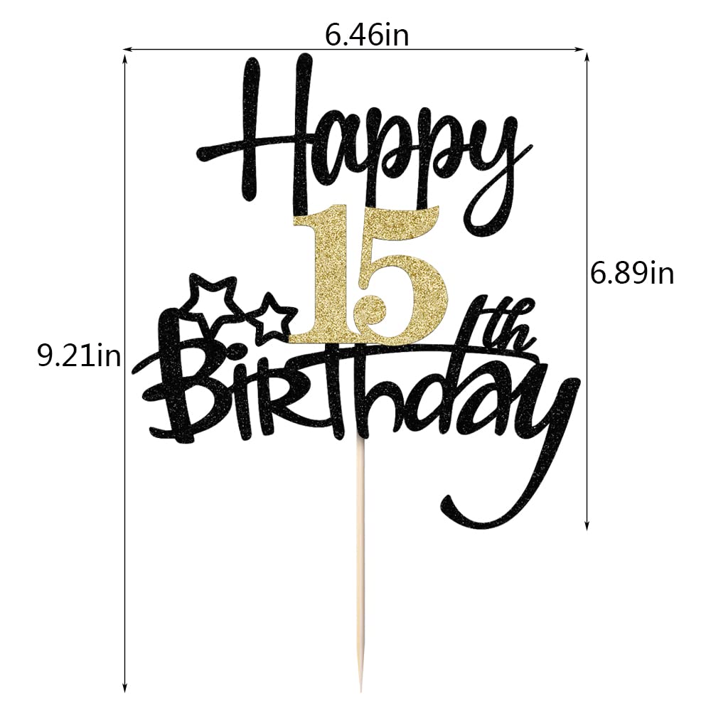 Q: What size is the Kaoenla Black Gold Glitter Happy 15th Birthday Cake Topper?A: The cake topper measures approximately 6.4 inches by 6.8 inches, making it a perfect size to stand out on your birthday cake.