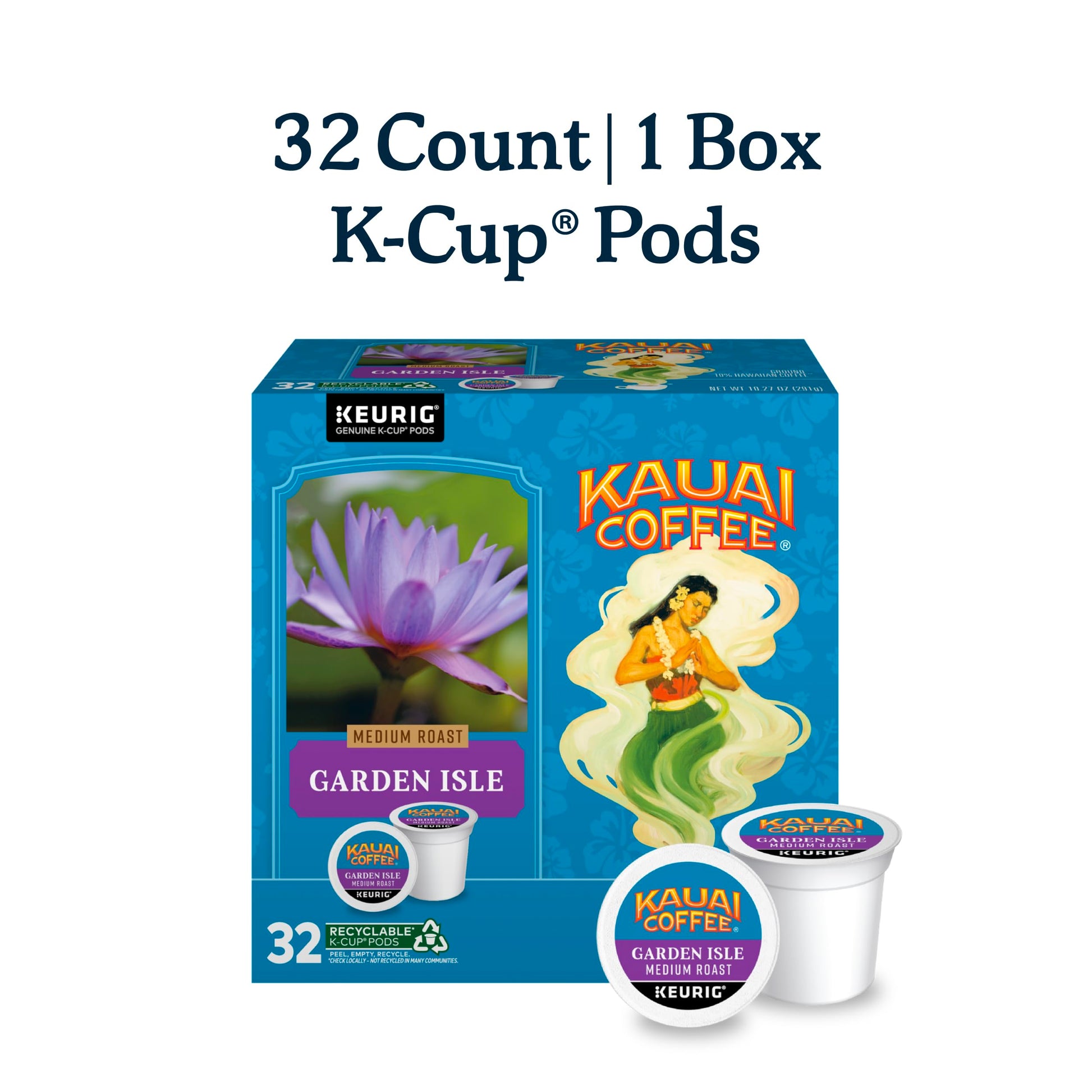Garden Isle Medium Roast - Light Floral Notes And Bright Aroma Makes This Blend A True Taste Of Paradise | 10% Hawaiian Origin Coffee - Grown And Harvested On The Island Of Kauai | For Keurig Coffee Makers - Kauai Coffee K-Cup Pods Are Designed For Use In Kuerig Brewers And K-Cup Compatible Single-Cup Brewing Systems; 32 Total Pods. Our Perforated Dispenser Box Offers Convenient Access To Your Pods While On Display | Arabica Coffee - The Mild Roast Single-Serve Coffee Pods Have A Smooth Taste With No Bitterness | Kauai Coffee Company Estate - Hawaii