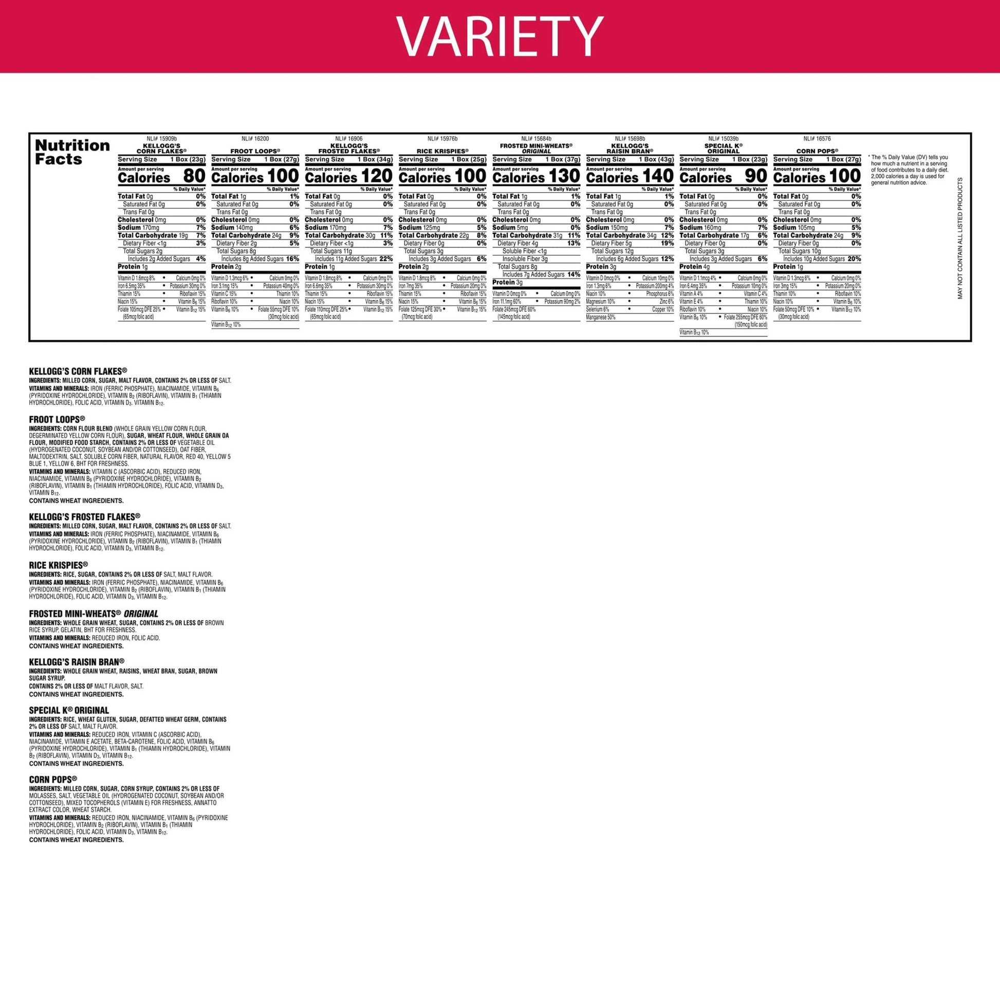 Kellogg'S Breakfast Cereal Assorted Variety Pack, Corn Flakes, Frosted Flakes, Frosted Mini-Wheats Original, Raisin Bran, Froot Loops, Corn Pops, Rice Krispies, Special K Original, Single Serve, 10.94 Oz (10 Count)