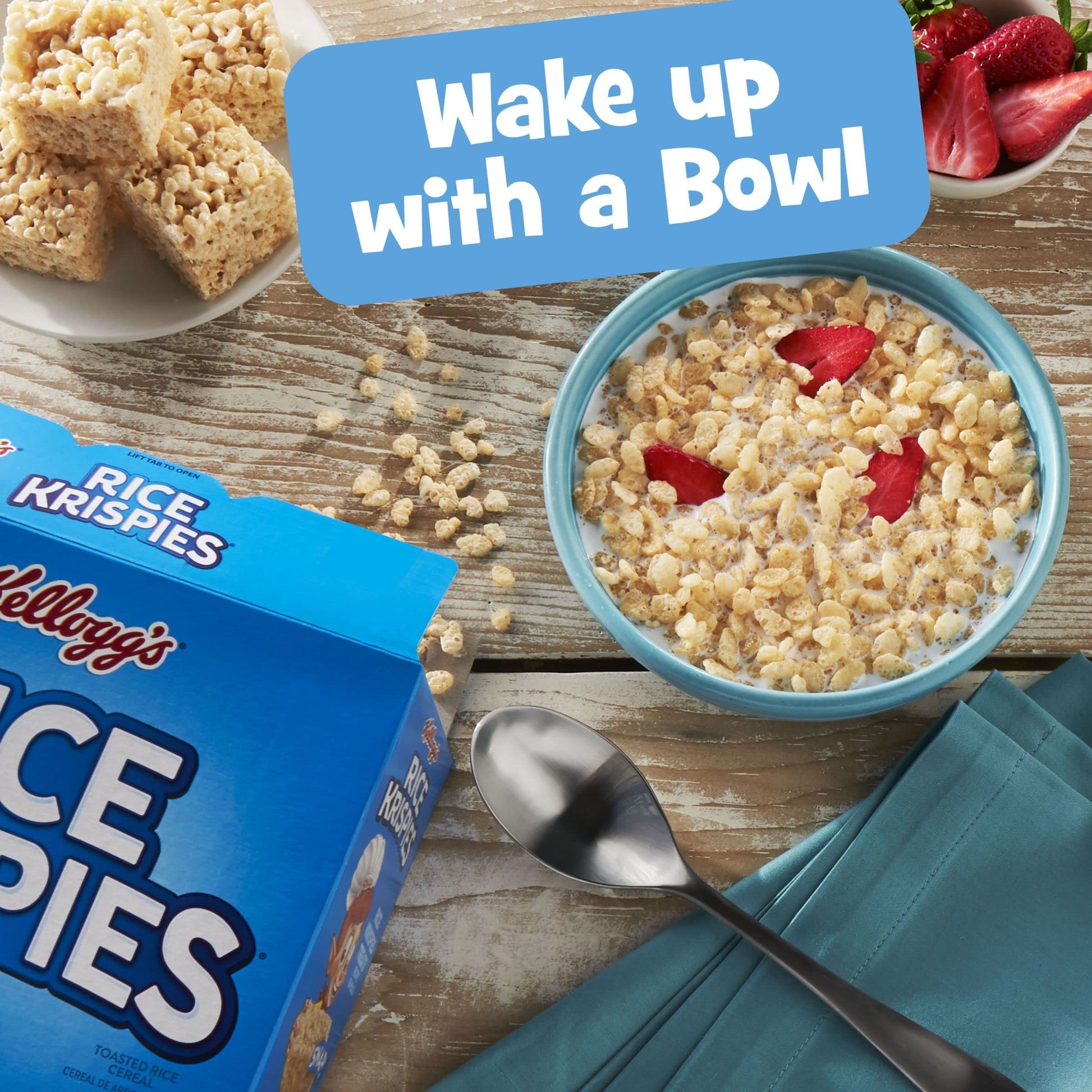 Whether youre enjoying it by the bowlful or through the tempting taste of The Original Treats recipe, Kelloggs Rice Krispies cereal makes it easy to bring a little magic to your day. Made with crispy oven-toasted puffed rice cereal, Rice Krispies are a satisfying and healthy way to start your morning. Ready in an instant, this cereal is a good source of 8 vitamins and minerals and is fat-free. Decorate your bowl with fresh strawberries, blueberries or bananas; Whip up a tasty batch of memories with your family by making The Original Treats recipe together. All you need are three simple ingredients: butter, marshmallows and Rice Krispies cereal. The delicious possibilities are endless with Kelloggs Rice Krispies cereal.