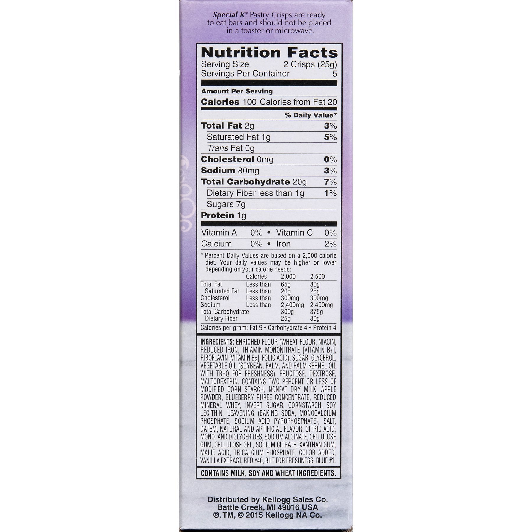 - Q: What are Kellogg's Special K Pastry Crisps made of? A: Kellogg's Special K Pastry Crisps are made with high-quality ingredients designed to provide a tasty snack option. Each pastry crisp is crafted to deliver a delightful blueberry flavor while maintaining a light and crispy texture.