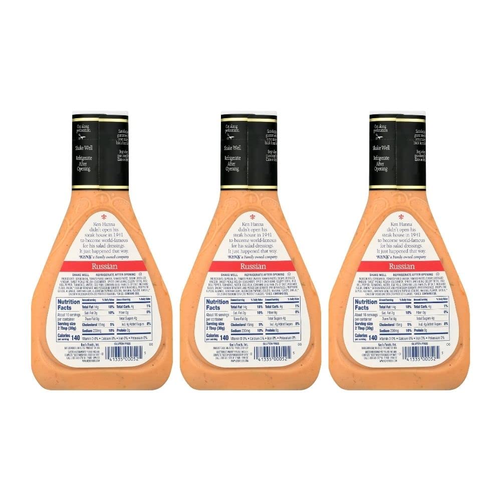 Q: What is the size and packaging of Ken's Steak House Russian Dressing?A: The dressing is available in a convenient 16-ounce bottle, and this listing includes a pack of 3, ensuring you have plenty on hand for your culinary needs.