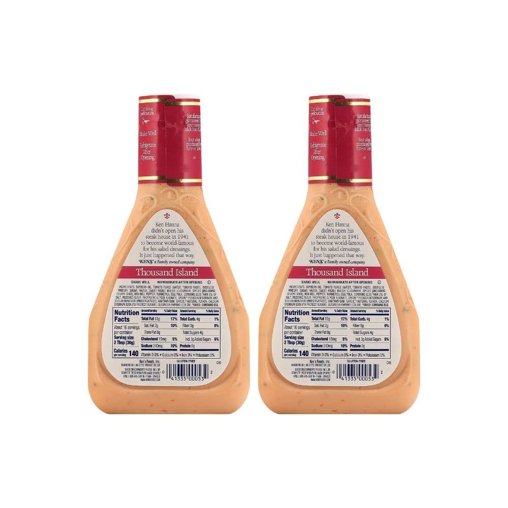 Q: What is Ken's Steak House Thousand Island Dressing made of?A: Ken's Steak House Thousand Island Dressing is a creamy blend of ingredients typically including mayonnaise, ketchup, relish, and various seasonings, designed to enhance salads and sandwiches.