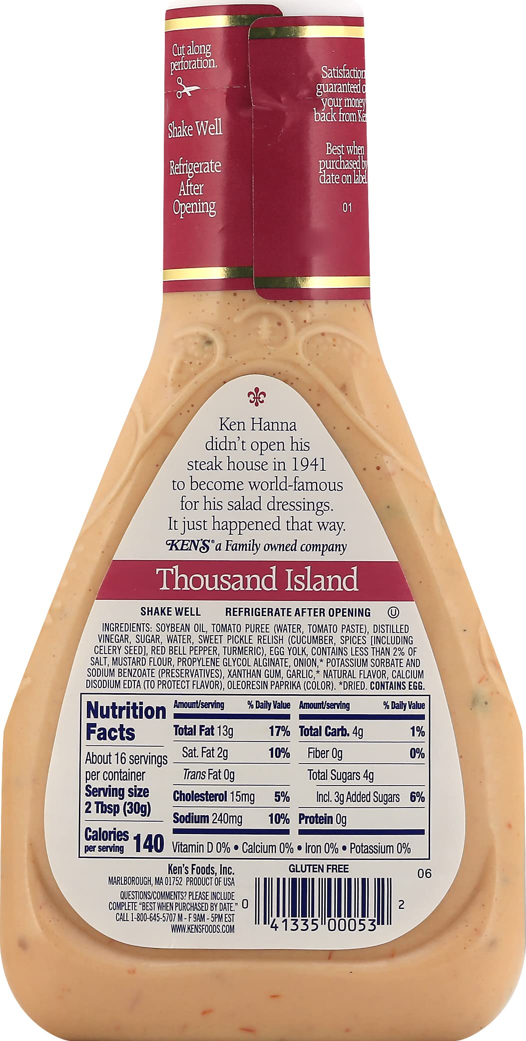 Q: Does Ken's Steak House Thousand Island Dressing contain any allergens?A: Ken's Steak House Thousand Island Dressing may contain allergens such as eggs and soy, so it's important to check the label for specific allergen information.