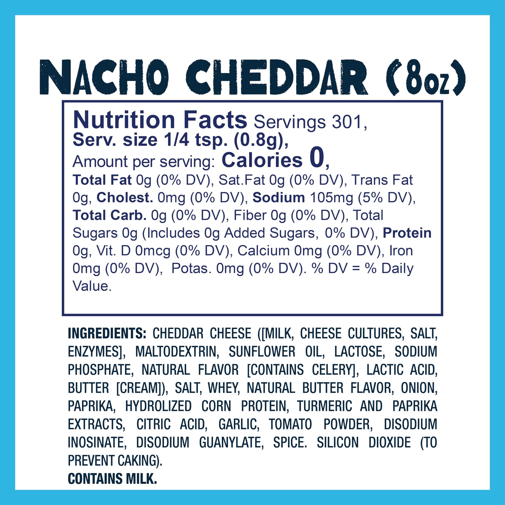 Tortilla Chips Shouldnt Have All The Fun. Our Nacho Cheddar Seasoning Blends Real Cheddar Cheese And Zesty Spices To Give Popcorn The Spicy Kick You Love.How To Use:1. Pop Your Favorite Popcorn. Dont Have One? Try Your New Favorite, Kernel Seasons Premium Popping Corn.2. Stovetop Popper? Use Kernel Seasons Movie Theater Butter To Pop Up A Kettle Full. Microwave Popper? Skip To Step 3.2. Spritz Your Popcorn With Kernel Seasons Popcorn Butter Spritzer To Help The Seasoning Stick To The Popcorn (You Could Also Top With Kernel Seasons Movie Theater Butter If Youre Feeling Extra Delicious).3. Sprinkle To Taste With Seasoning.4. Shake To Cover More Popcorn.5. Enjoy!Nutritionserv. Size: 1/4 Tsp. (0.8G). Servings Per Container: 100, Amount Per Serving: Calories 2, Total Fat 0G (0% Dv), Trans Fat 0G, Sodium 90Mg (4% Dv), Total Carb. 0G (0% Dv), Sugars 0G, Protein 0G. Not A Significant Source Of Other Nutrients. Percent Daily Values Are Based On A 2,000 Calorie Diet.What'S In This Stuff?Ingredients: Cheddar Cheese (Blend Of Cheddar Cheese, [Milk, Cheese Cultures, Salt, Enzymes], Maltodextrin, Whey, Soybean Oil, Lactose, Citric Acid, Lactic Acid), Salt, Butter Milk Solids, Onion, Paprika, Hydrolyzed Corn Protein, Turmeric And Paprika Extractives, Tomato Powder, Disodium Inosinate And Guanylate, Spice. Silicon Dioxide Added To Prevent Caking.