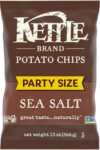 Q: What is the serving size for Kettle Brand Sea Salt Potato Chips?A: The Kettle Brand Sea Salt Potato Chips come in a 13 oz party size bag, perfect for sharing or enjoying as a snack. The serving size is typically about 1 ounce, which contains approximately 150 calories.