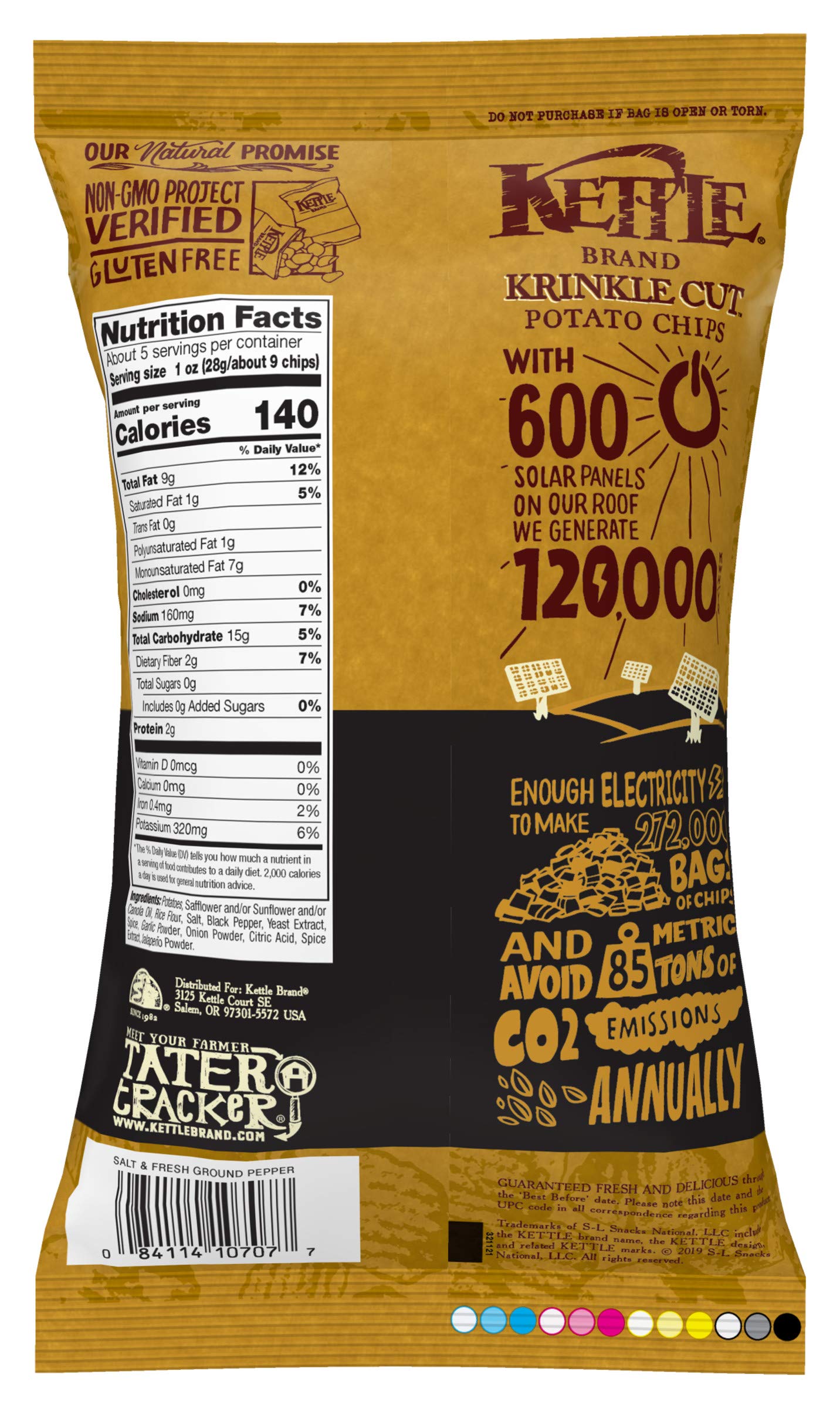 Kettle Krinkle Cut Salt And Fresh Ground Pepper Potato Chips - 5 Oz. Bag, 15 Per Case The Cycle Of Spice Never Ends In Darkness, There Is Light. In Light, Dark. Yes, We Thought To Ourselves, But How Do We Apply This To Chips? Deep And Crunchy Krinkle Cut Ridges Hold The Beginning And The End Of All Spices - Sharp, Spicy Pepper Intermingled With The Lightness Of Salt To Create, Yes, The Perfect Yin Yang. Kosher 5 Ounce