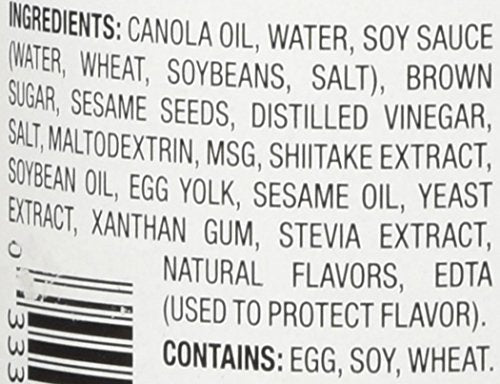 - Q: What ingredients are in Kewpie Japanese Dressing Roasted Sesame? A: Kewpie Japanese Dressing Roasted Sesame contains canola oil, water, soy sauce (water, wheat, soybeans, salt), brown sugar, sesame seeds, distilled vinegar, salt, maltodextrin, MSG, shiitake extract, soybean oil, egg yolk, sesame oil, yeast extract, xanthan gum, stevia extract, natural flavors, and EDTA (used to protect flavor).