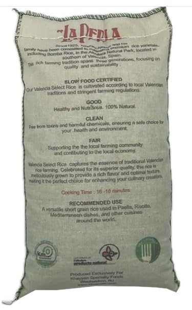 - Q: What certifications does La Perla Valencia Select Paella Rice have? A: La Perla Valencia Select Paella Rice is certified by Slow Food Valencia, Kilometro Cero, and Alimentacion Responsable, highlighting its quality and ethical sourcing.