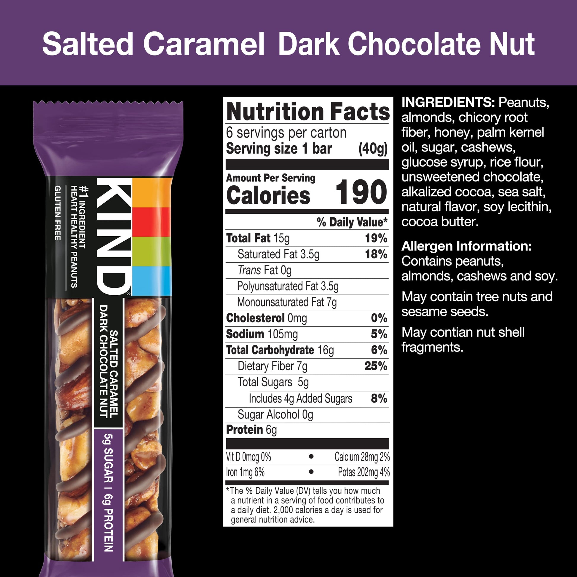 Q: What are the key ingredients in KIND Nut Bars?A: KIND Nut Bars are primarily made with heart-healthy almonds as the first ingredient. They also include salted caramel, dark chocolate, and other high-quality ingredients that are non-genetically modified.