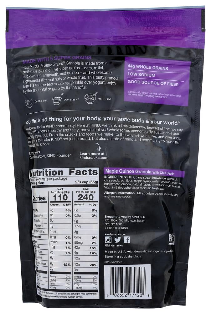 Details:Kind maple quinoa clusters granola is a delicious blend of wholesome ingredients like super grains and chia seeds We combine oats, buckwheat, amaranth, millet and quinoa to provide 32 g Of whole grains per serving Our granola blend is a low-sodium snack Each 11 oz Bag of granola is non-gmo project verified and gluten-freecountry of origin : united statesis gluten free : yesis gmo free : yesis kosher : yessize : 11 ozpack of : 6selling unit : caseingredients : oatscane sugarbrown ricecanola oilchia seedsoat flourmaple syrupmilletamaranthmolassesbuckwheatquinoanatural flavorbrown rice syrupsea saltvitamin etocopherols to maintain freshnesskeywords : barcerealchiafiberfreeglutengmograinnonsnackwhole