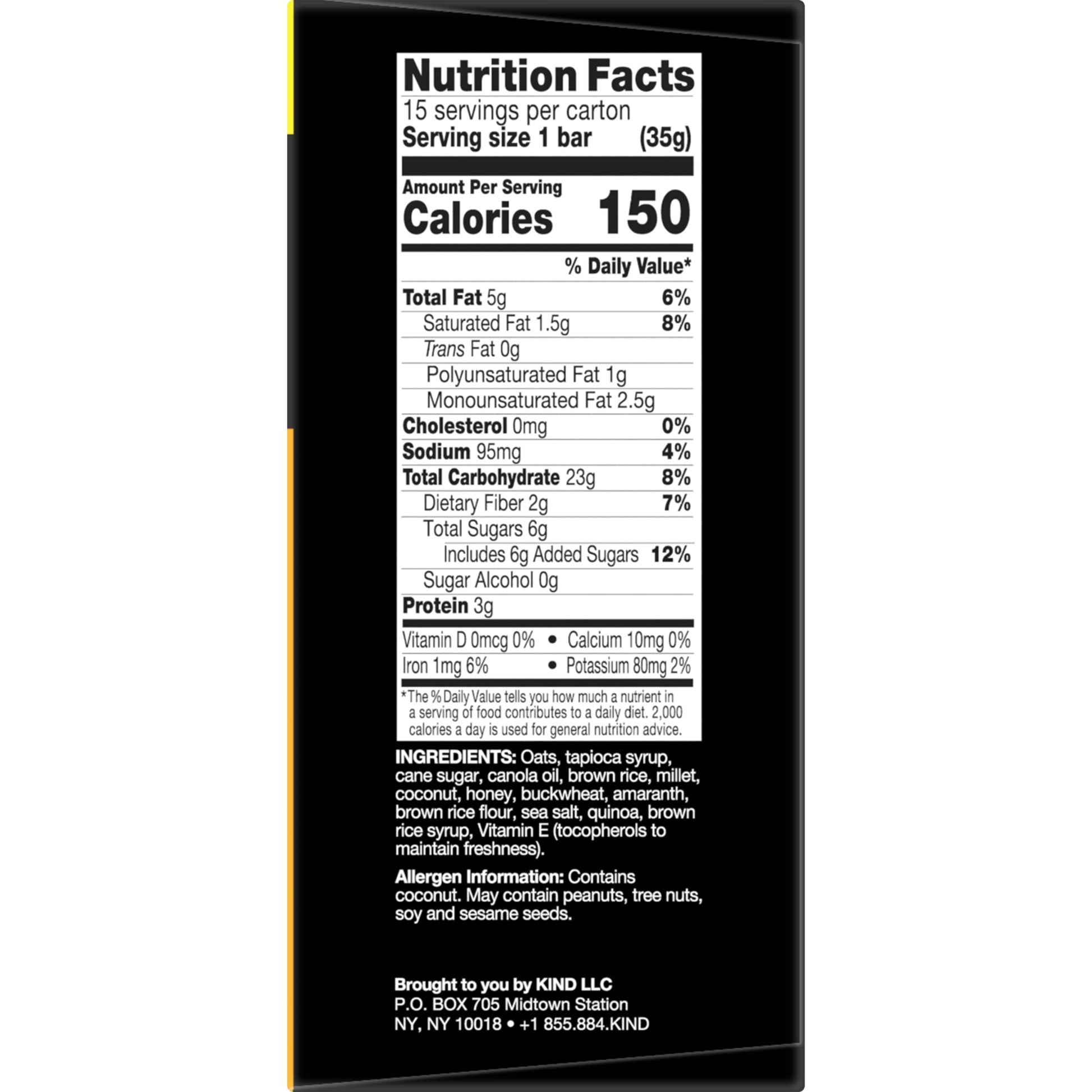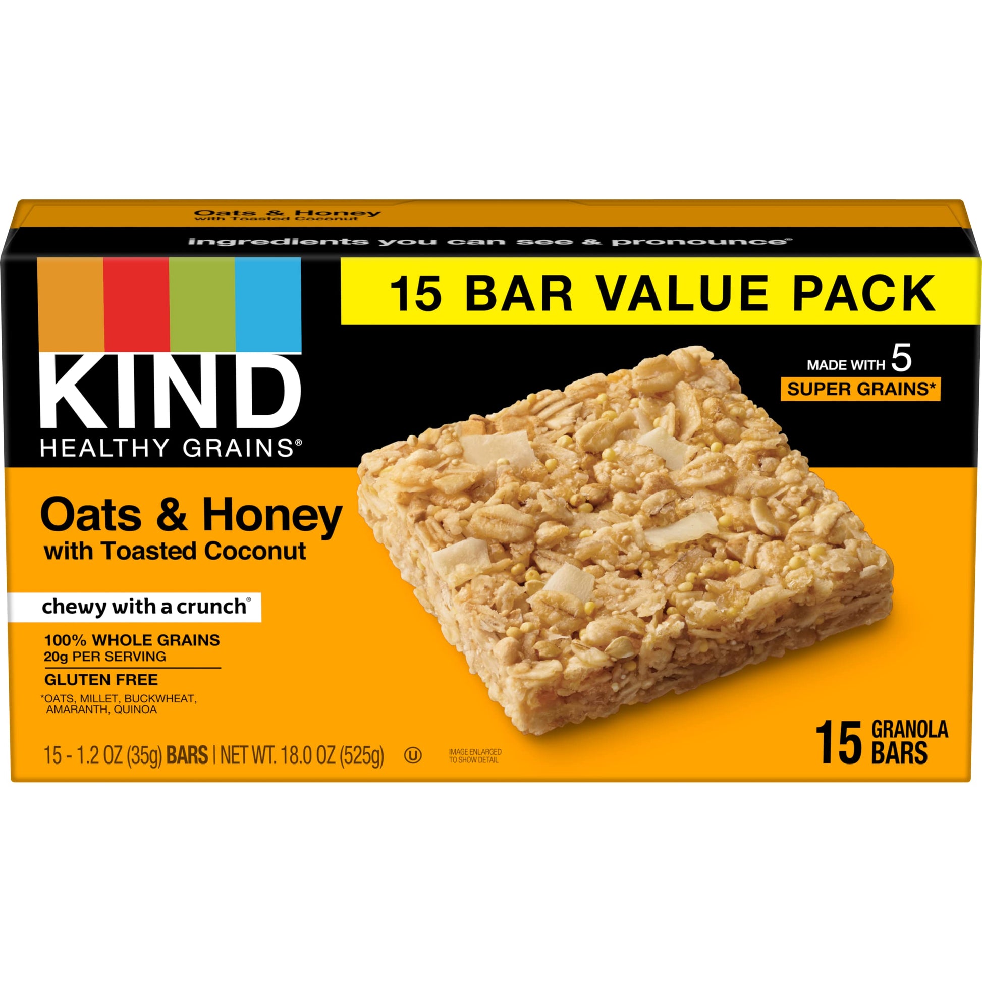 KIND HEALTHY GRAINS Oats & Honey with Toasted Coconut bars are gluten free bars that combine 100% whole grains with toasted coconut and real honey. These snack bars combine five super grains - oats, millet, buckwheat, amaranth and quinoa - making this a nutrient-dense snack with a unique chewy and crunchy texture. These individually wrapped snacks, made with quality ingredients, are a convenient option for on-the-go snacking. KIND HEALTHY GRAINS Oats & Honey with Toasted Coconut bars can be enjoyed at home, in the car, or running out the door. With 20 grams of whole grains, KIND Oats & Honey with Toasted Coconut bars are the perfect pick-me-up for your busy day. KIND HEALTHY GRAINS bars are also kosher snacks that are made without genetically engineered ingredients.