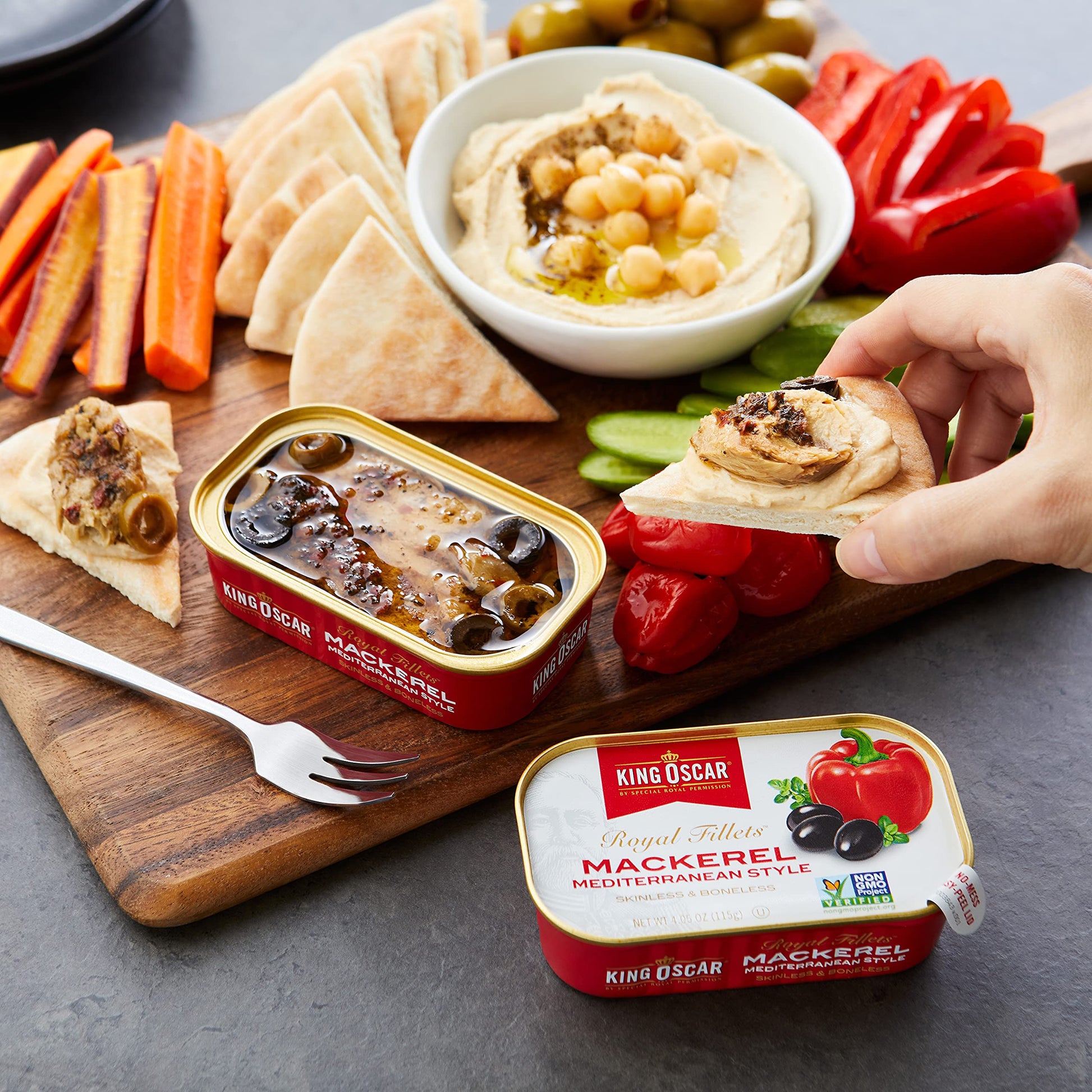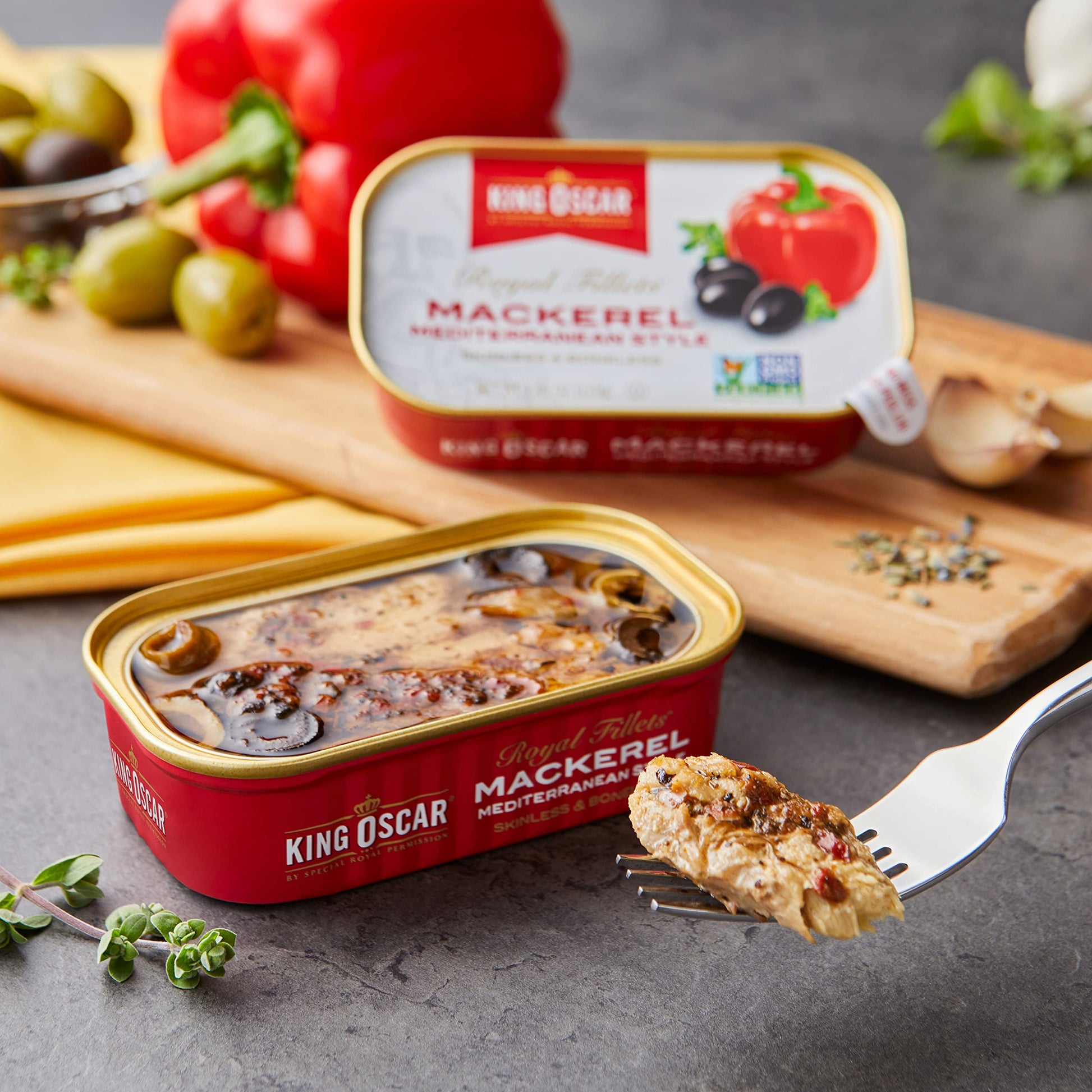 - Q: What are the ingredients in King Oscar Skinless and Boneless Mediterranean Style Mackerel Fillets? A: The King Oscar Skinless and Boneless Mediterranean Style Mackerel Fillets primarily contain mackerel fish, water, and salt. These fillets are packed in a delicious Mediterranean style, often enhanced with natural flavors.