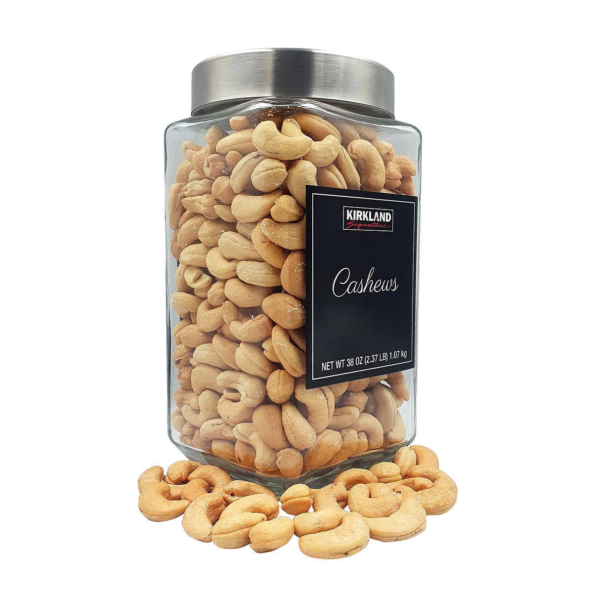 - Q: What is the weight of the Kirkland Signature Black Label Premier Cashews package? A: The Kirkland Signature Black Label Premier Cashews come in a 38-ounce package, providing a generous amount for snacking or cooking.
