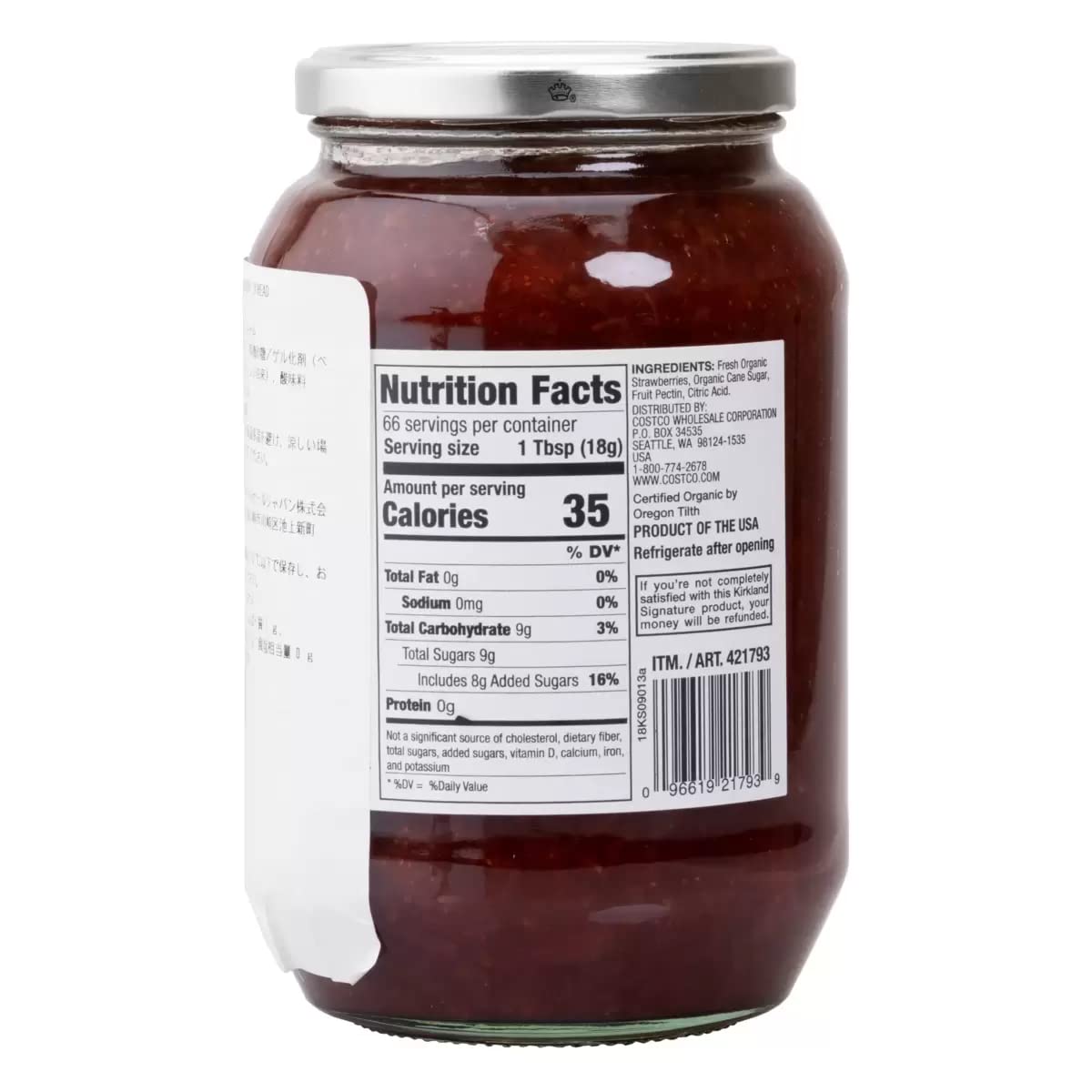 Q: What are the main ingredients in Kirkland Signature Organic Strawberry Spread?A: Kirkland Signature Organic Strawberry Spread is made with fresh strawberries and contains 40% more strawberries than traditional fruit preserves, ensuring a rich and flavorful taste.