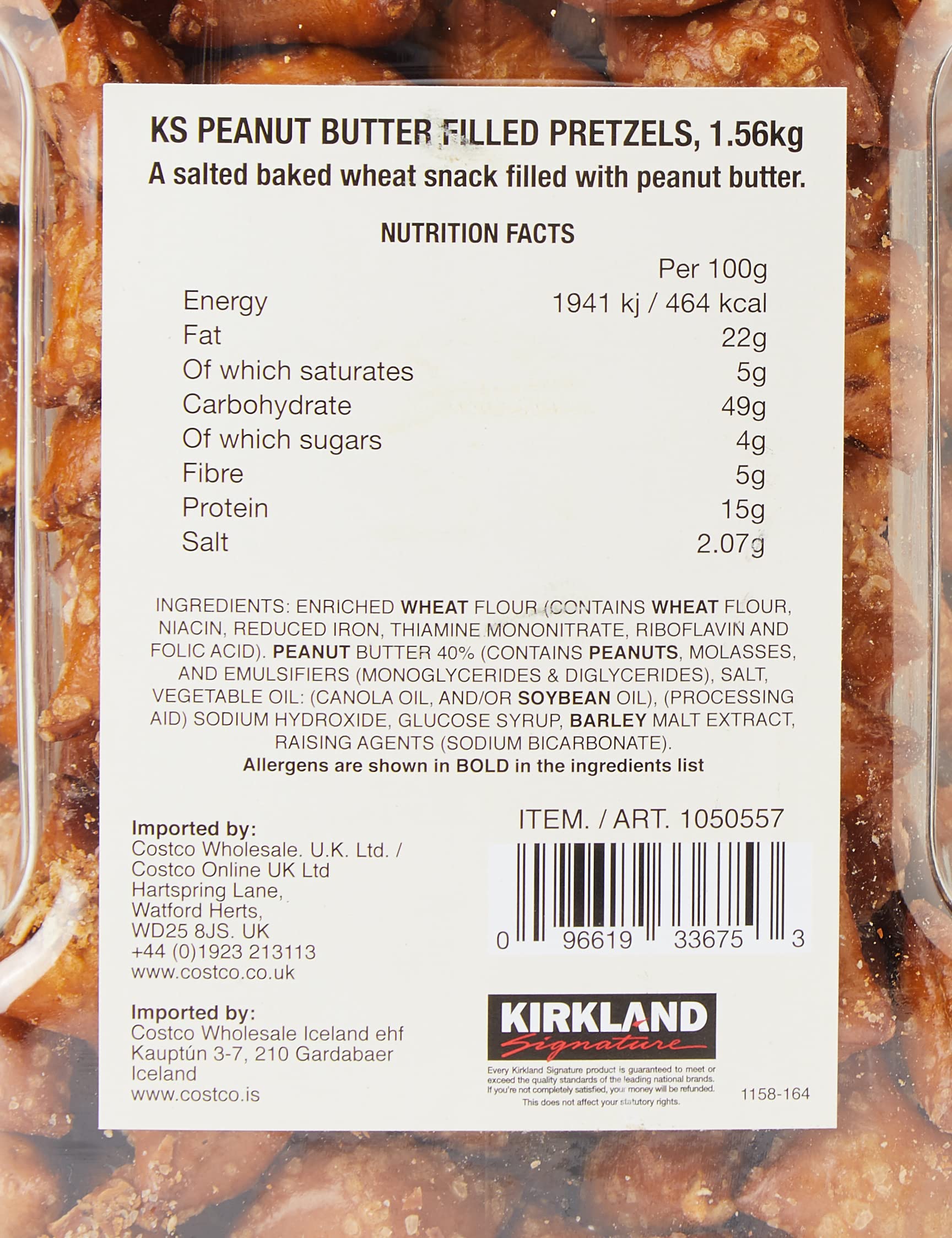 Q: What are the ingredients in Kirkland Signature Peanut Butter Pretzels?A: Kirkland Signature Peanut Butter Pretzels typically contain pretzel shells filled with creamy peanut butter. For specific ingredient details, please refer to the packaging as ingredients may vary.