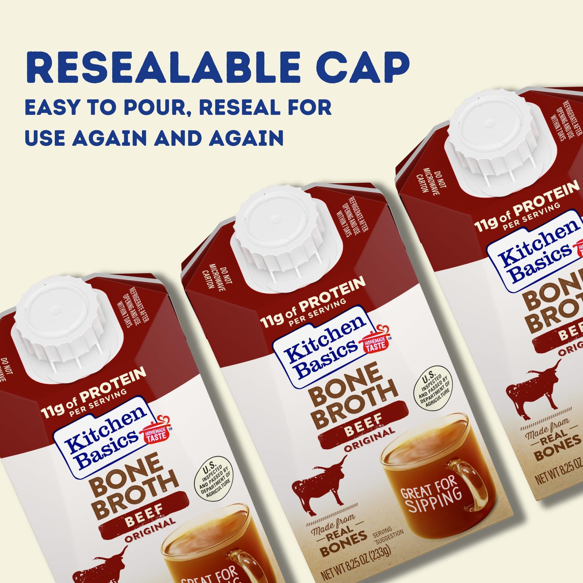 Kitchen Basics Beef Bone Broth offers a rich savory broth made from real beef bones & tender herbs. Enjoy this gluten free beef bone broth as a comforting sippable drink, or use it in recipes that call for stock, broth or bouillon. Amplify the flavor of sauce, gravy and side dishes like mashed potatoes or rice.