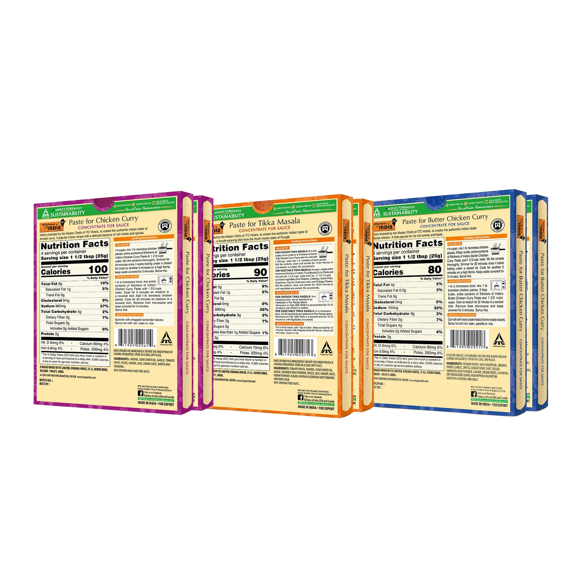 This combo pack contains 3 varieties of curry pastes. Make a creamy Butter Chicken with Kitchens of India Paste for Butter Chicken Curry, lip-smacking Tikka Masala with Kitchens of India Paste for Tikka Masala, or a yummy Chicken Curry with Kitchens of India Paste for Chicken Curry. These rich, exotic spice pastes are the perfect concentrates to create these curry sauces. Simply add water to a pack and then add tender pieces of chicken, cook it for some time either on the pan or in the microwave and your food is ready. You can also create vegetarian or vegan food with Paneer cheese cubes or vegetables.