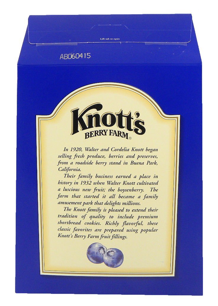In 1920, Walter and Cordelia Knott began selling fresh produce, berries and preserves, from a roadside berry stand in Buena Park, California. Their family business earned a place in history in 1932 when Walter Knott cultivated a luscious new fruit - the boysenberry. The farm that started it all became a family amusement park that delights millions. The Knott family is pleased to extend their tradition of quality to include premium shortbread cookies. Richly flavorful, these classic favorites are prepared using popular Knott's Berry Farm fruit fillings. You will love these cookies. Allergy Information: This product is manufactured in a facility that processes milk, eggs, soy products, wheat, peanuts, pecans, almonds, walnuts, cashews, macadamia nuts & other tree nuts.