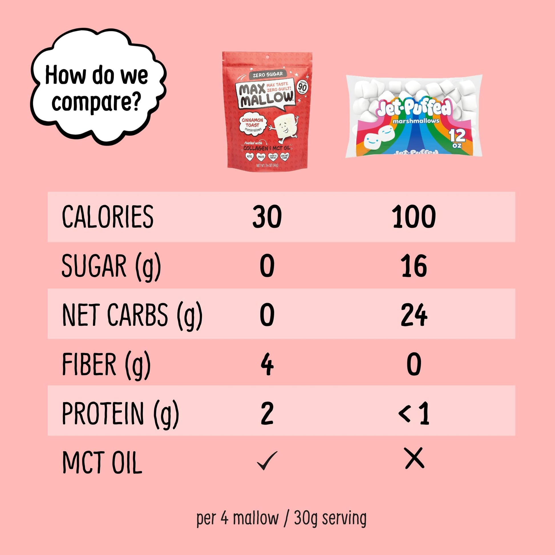 Q: What are the key ingredients in Know Brainer Max Mallow Cinnamon Toast Marshmallows?A: Know Brainer Max Mallow Cinnamon Toast Marshmallows are made with collagen, MCT oil, and monk fruit, providing a guilt-free treat that is low in carbs and sugar.