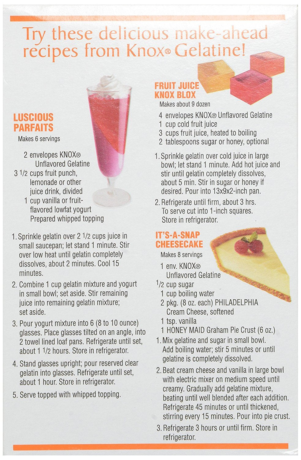 Q: What can I make with Knox Original Unflavored Gelatin?A: Knox Original Unflavored Gelatin is versatile and can be used to create a wide variety of desserts, including parfaits, cheesecakes, homemade marshmallows, and fruity gelatin treats. You can also use it as a thickening agent in recipes.