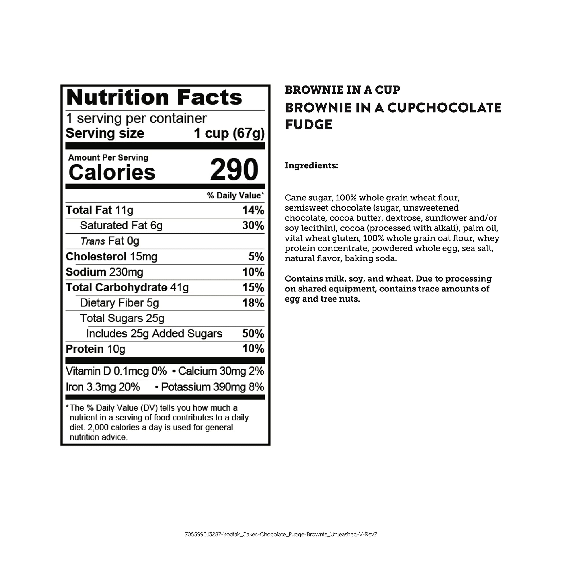 - Q: Are there any allergens in Kodiak Cakes Chocolate Fudge Brownie in a Cup? A: Yes, Kodiak Cakes Chocolate Fudge Brownies contain wheat and may also contain traces of nuts due to shared processing facilities. Always check the packaging for specific allergen information.