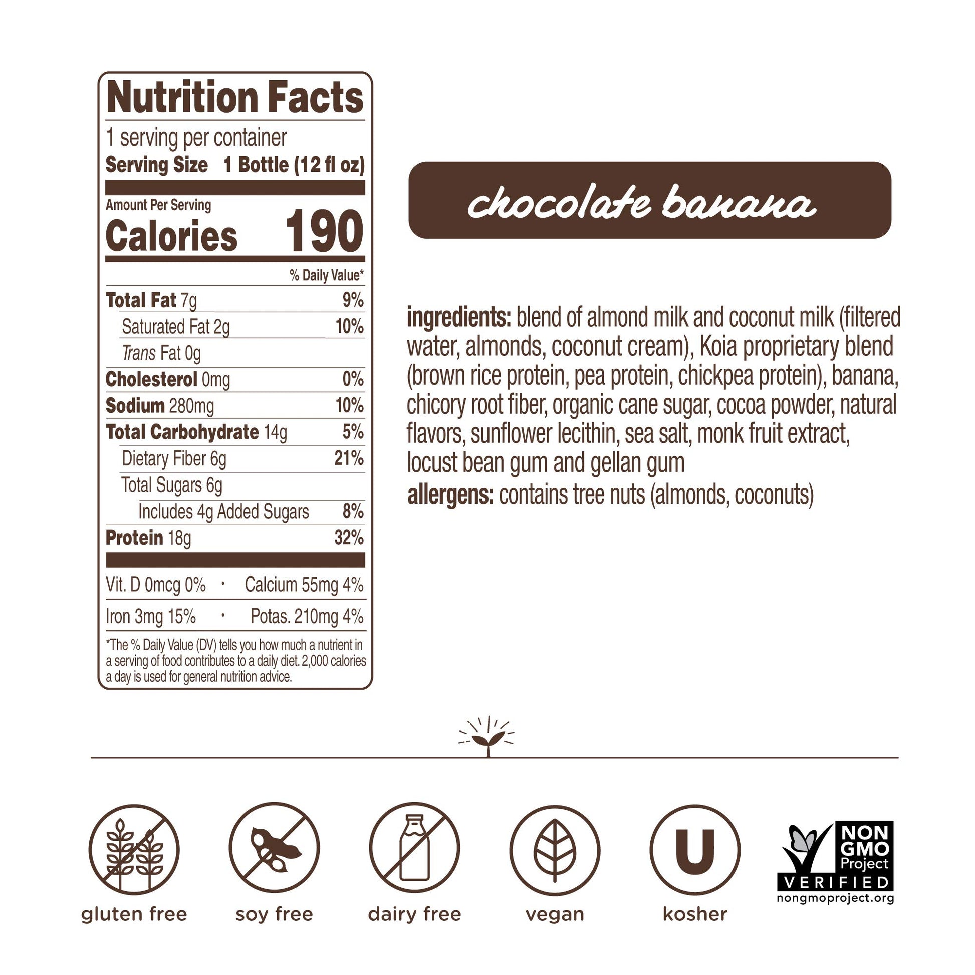 Q: What are the main ingredients in Koia Protein Shake?A: Koia Protein Shake is made from a blend of almond milk, brown rice protein, pea protein, and chickpea protein, combined with natural flavors like sweet bananas and smooth chocolate. This makes it a delicious and nutritious choice for those seeking a plant-based protein option.
