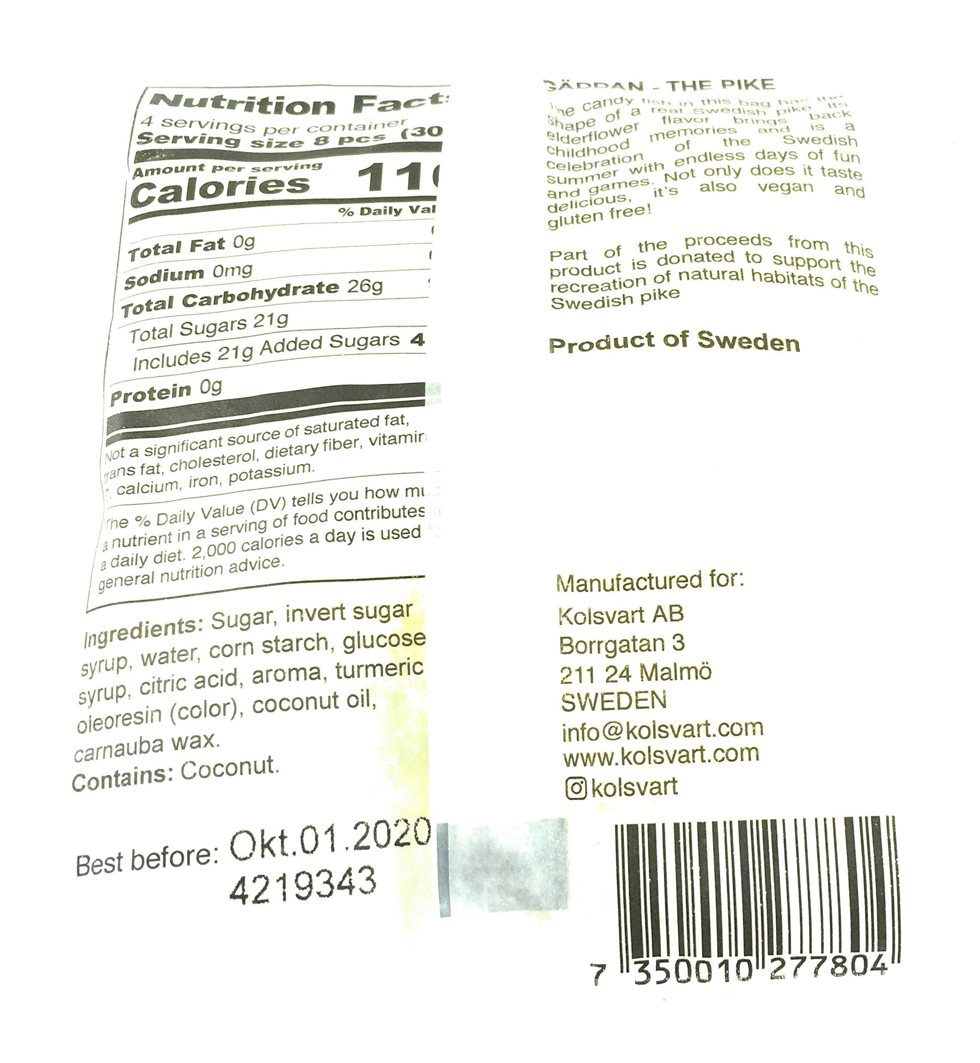 Q: What are the main ingredients in Kolsvart Gaddan Elderflower Candy?A: Kolsvart Gaddan Elderflower Candy is made without hydrogenated fats, high fructose corn syrup, bleached or bromated flour, and synthetic nitrates or nitrites, focusing on natural ingredients for a healthier candy option.
