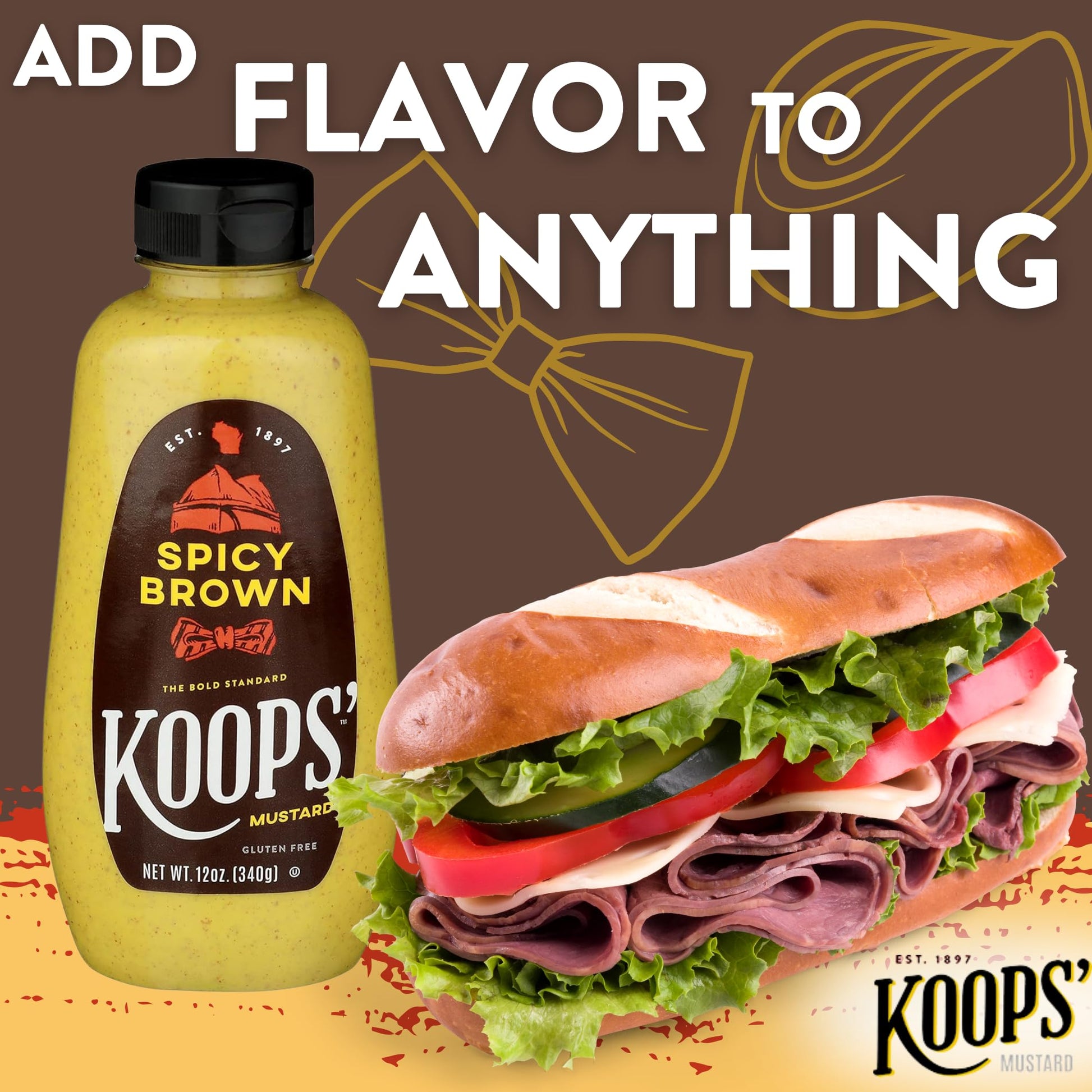 Q: How can I use Koops' Spicy Brown Mustard in my cooking?A: You can use Koops' Spicy Brown Mustard to enhance the flavor of sandwiches, burgers, hot dogs, and salads. It can also be used as a marinade or a dip, adding a spicy kick to your favorite recipes.