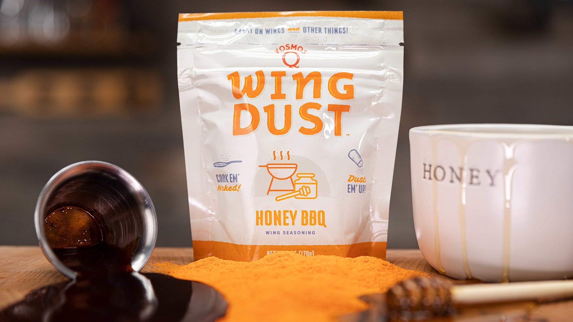 - Q: What is Kosmos Q Honey BBQ Wing Dust made of? A: Kosmos Q Honey BBQ Wing Dust is a blend of sticky sweet honey flavor combined with smoky spices such as garlic, onion, and paprika, creating a unique flavor profile suitable for various dishes.