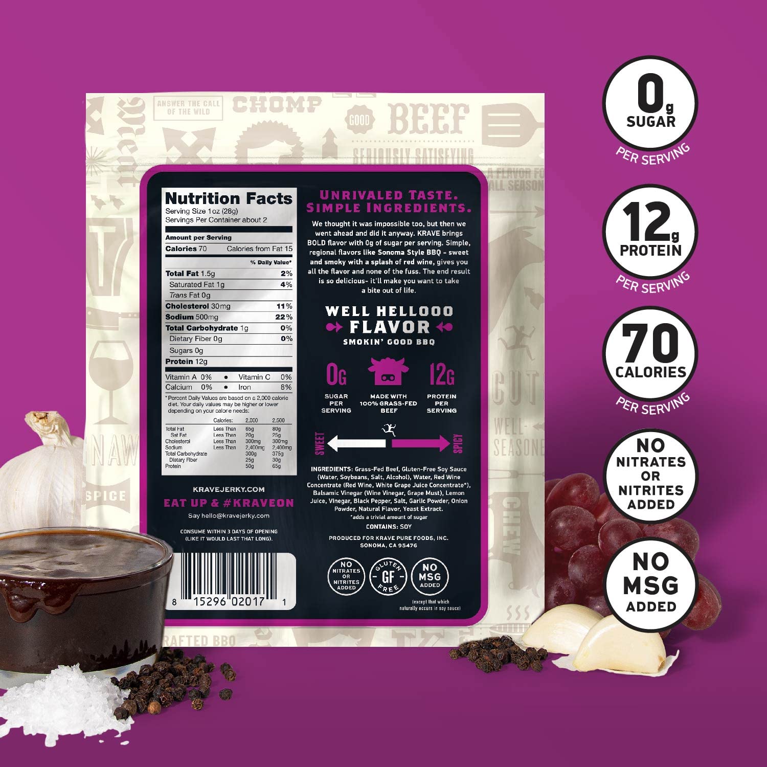 Q: What makes KRAVE Zero Sugar Beef Jerky a healthier snack option?A: KRAVE Zero Sugar Beef Jerky is made from 100% grass-fed beef and contains no artificial ingredients. With at least 8g of protein per serving and being gluten-free, it's a guilt-free high-protein, low-carb snack that satisfies your cravings without compromising on health.