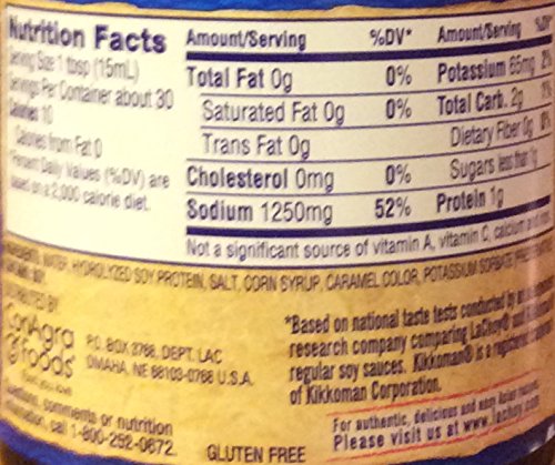 Ingredients: Water, Hydrolyzed Soy Protein, Corn Syrup, Salt, Caramel Color, Potassium Sorbate (Preservative). Contains: Soy.
