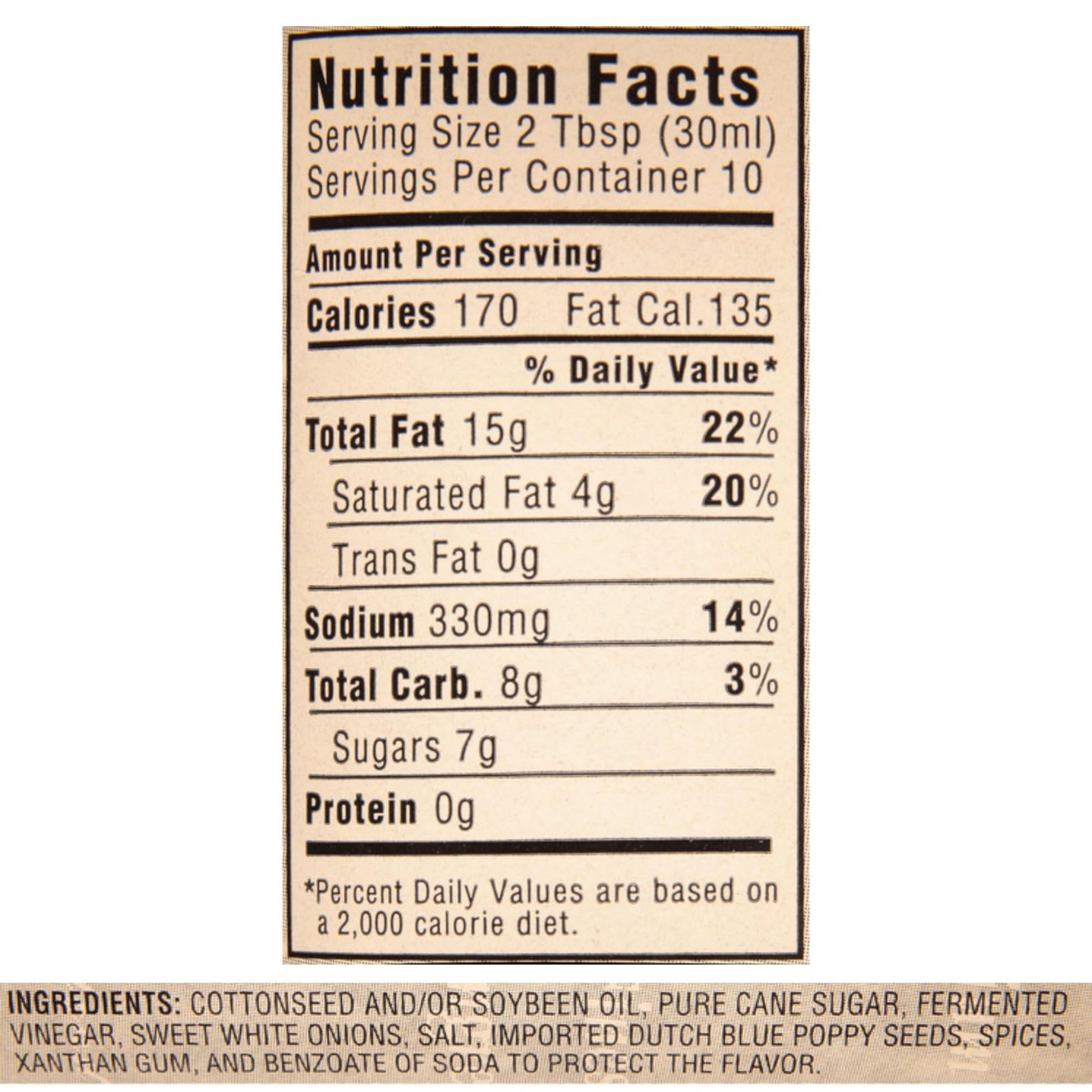 Q: What are the main ingredients in La Martinique Original Poppy Seed Dressing?A: La Martinique Original Poppy Seed Dressing is made with premium Dutch Blue poppy seeds, offering a unique flavor profile that elevates your salads and dishes.
