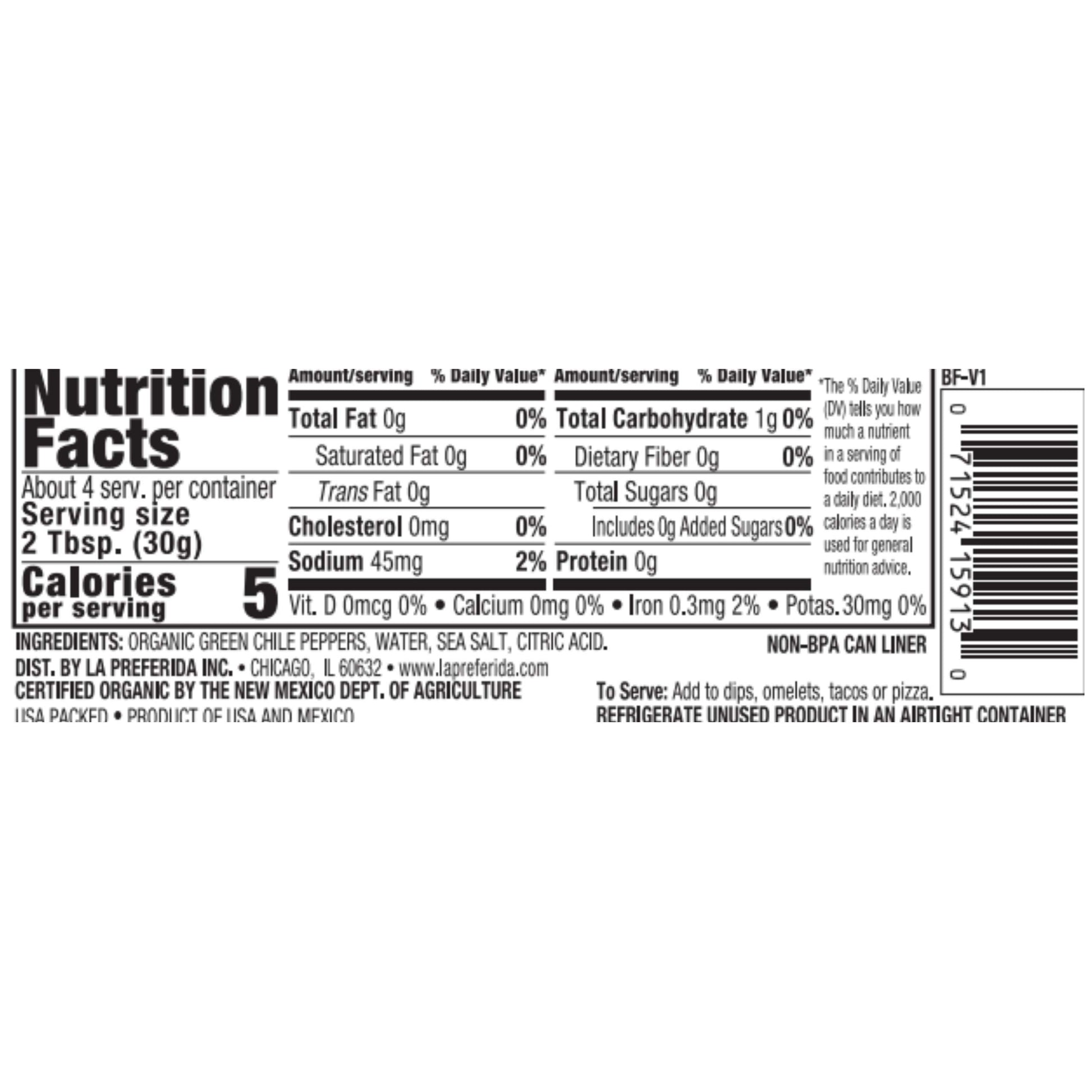 Q: What are the main ingredients in La Preferida Organic Green Chiles?A: La Preferida Organic Green Chiles are made with organic green chile peppers, water, sea salt, and citric acid, ensuring a simple and wholesome ingredient list.