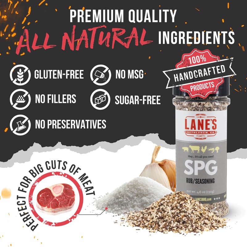 - Q: What are the main ingredients in Lane's SPG Seasoning? A: The primary ingredients in Lane's SPG Seasoning include coarse ground salt, black pepper, and garlic. It is all-natural and contains no MSG, preservatives, or artificial additives.